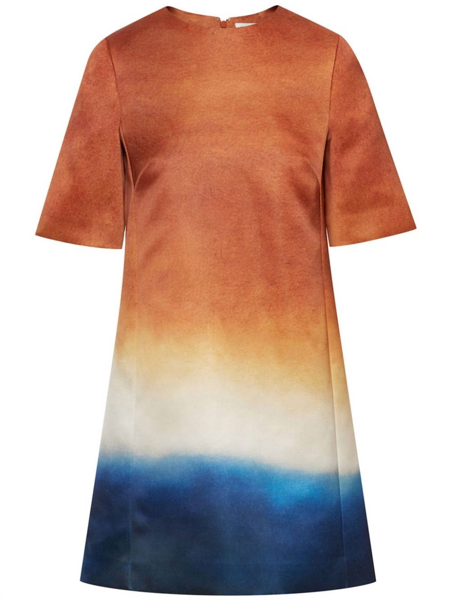 The perfect mini dress for those warmer months. Experience effortless elegance with the Abstract Ombré Shift Dress by Oscar de la Renta, featuring a mesmerizing canyon and navy tie-dye pattern. Designed in a women's shift silhouette with a round neck and short sleeves, this mini dress is perfect for a summer vacation. Made in Italy with a luxurious silk lining and an above-knee length that complements its curved hem. Closure: Rear zip closure. Care: Dry clean only.