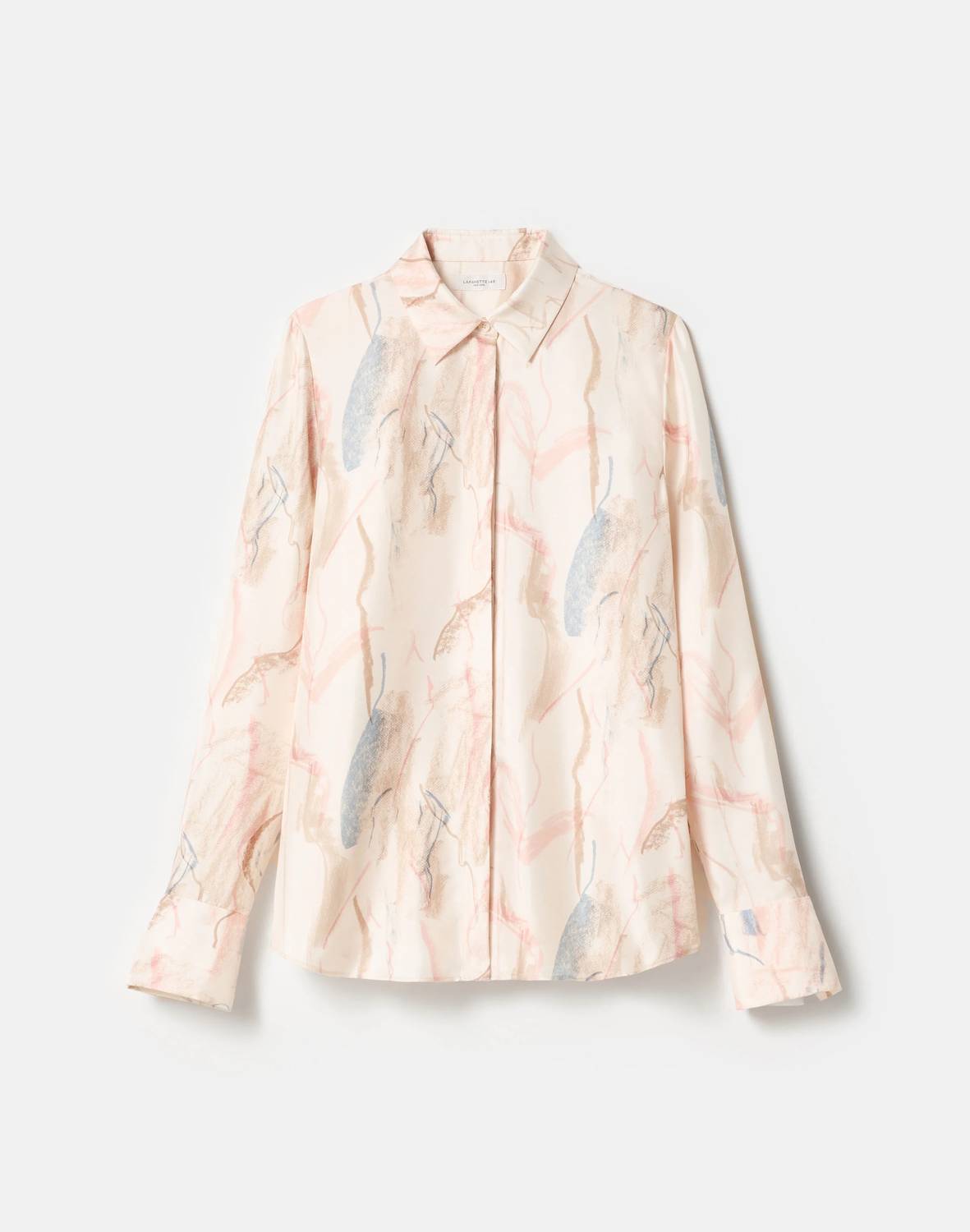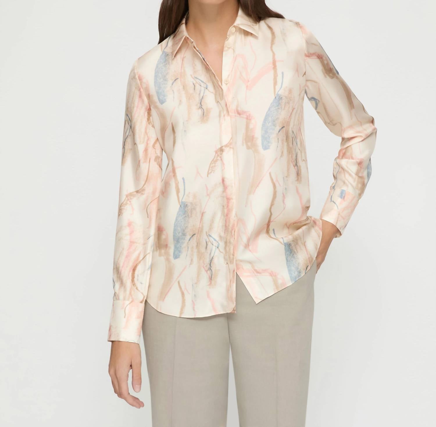 A versatile blouse that works from desk to dinner! Lafayette 148's signature button-front blouse is elevated with dimension by the collection's gesture artwork printed atop pure silk twill, chosen for its refined luster and fluid drape. The relaxed cut is refined by crisp collar points, buttoned cuffs and classic shirttail hem.