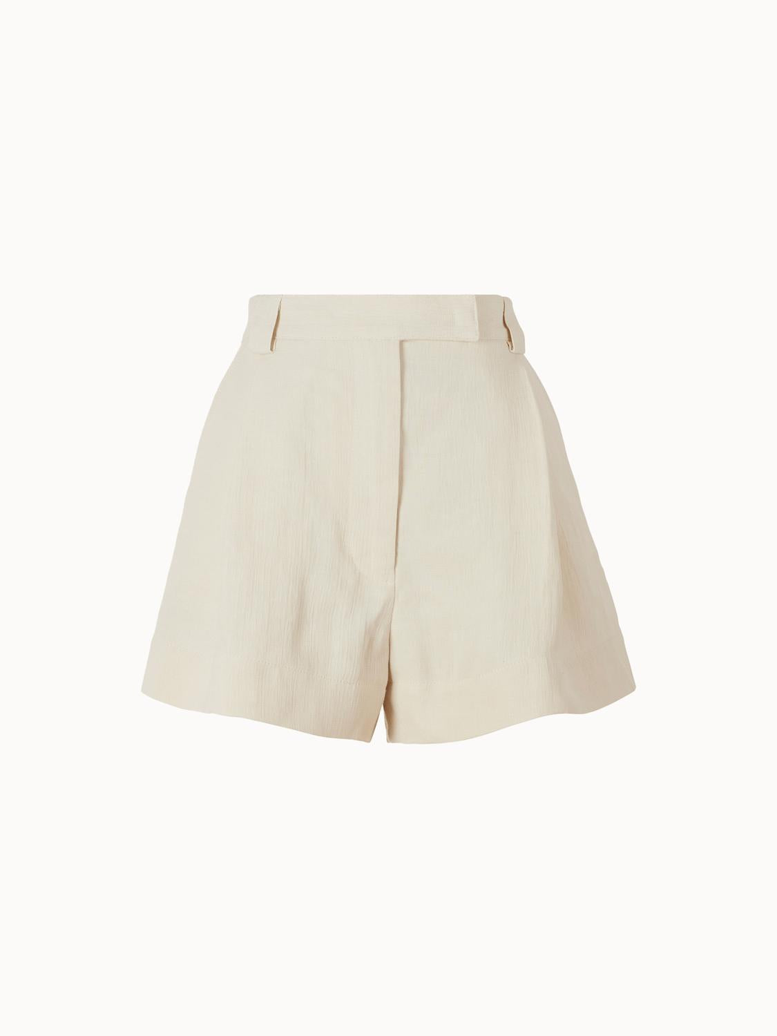 Tuck your favorite tee into these high-waist shorts for a more casual-cool feel. Elevate your summer wardrobe with the Leo Short by RACHEL COMEY, crafted in a chic cream hue. These high-waisted shorts feature a pleated, wide-leg design with a convenient zipper and extended tab button closure. Made from a luxurious blend of 52% Linen and 48% FSC Viscose, they offer both comfort and style. Perfect for vacation occasions, these shorts are a minimalist staple that should be dry cleaned to maintain their quality.