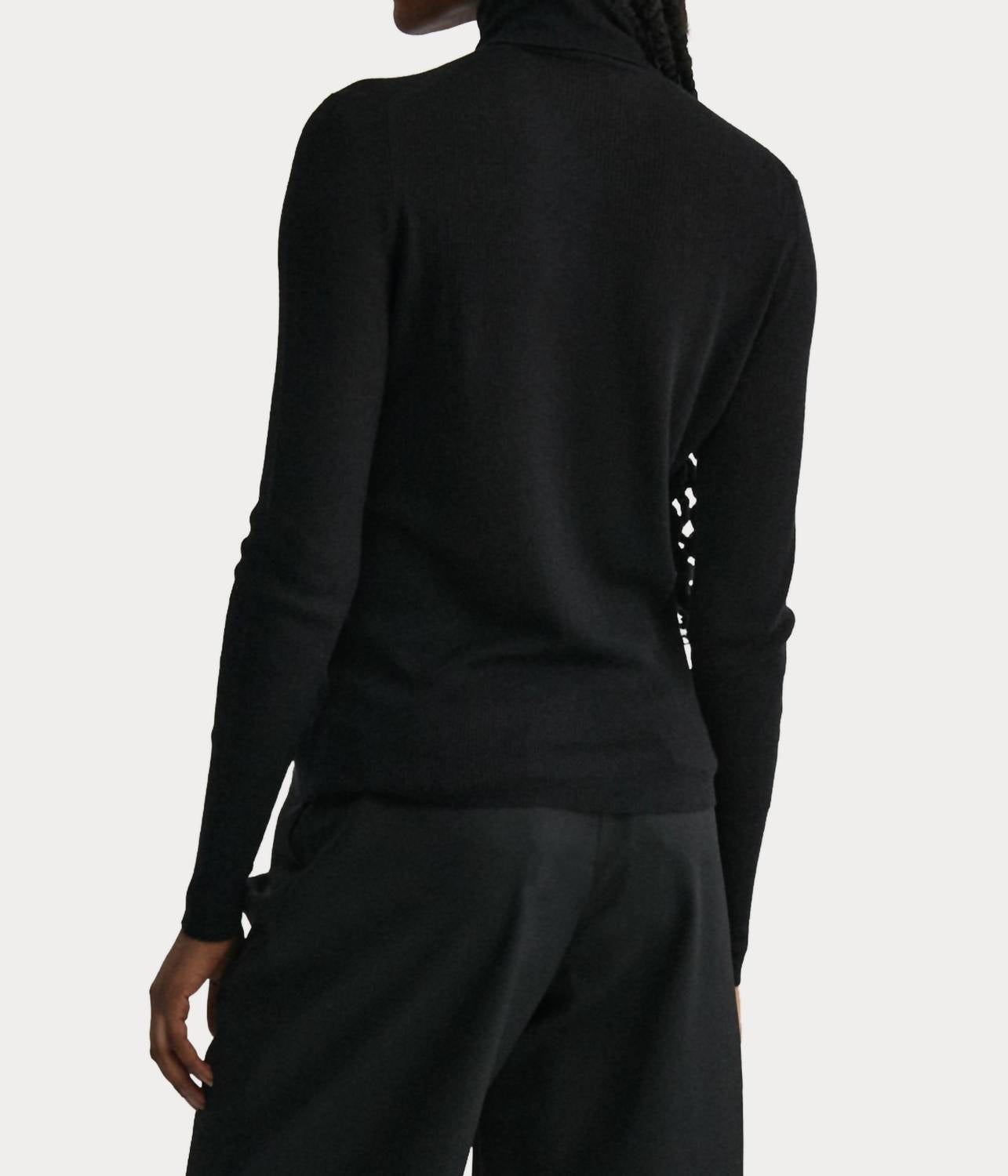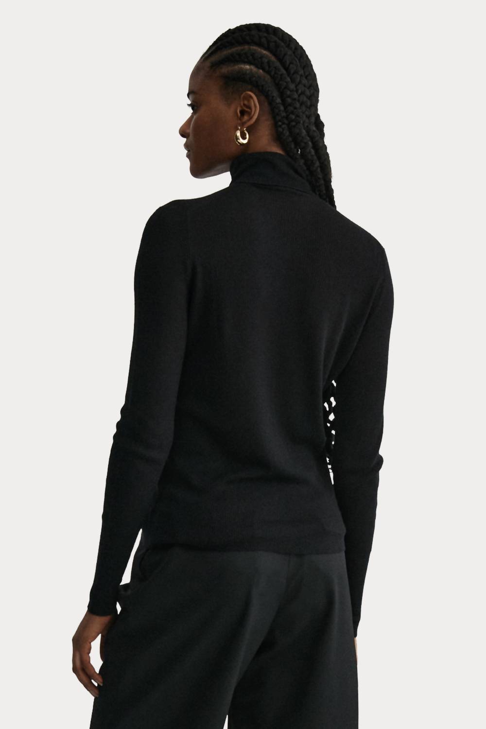 Fit to perfection and effortlessly chic. Introducing the Lehto Turtleneck Sweater by RACHEL COMEY, an embodiment of quiet luxury in timeless black. This women's turtleneck features long sleeves and is crafted from a soft, semi-sheer ribbed fabric blending 90% Lyocell and 10% Cashmere, perfect for cool weather occasions like a dinner party. The sweater is designed with a pull-on closure for ease and features a solid pattern, making it a versatile addition to your wardrobe. While specific care instructions are not provided, the high-quality composition suggests gentle care to maintain its luxurious feel.