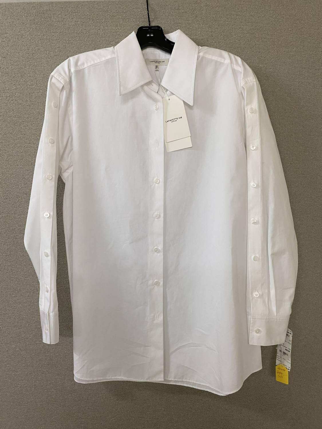 Perfectly tailored and soft to the touch. The Women's Button Sleeve Oversized Shirt by Lafayette 148 is a chic addition to any wardrobe, crafted in a timeless white solid pattern. This long sleeve shirt provides a polished look with a classic collar and convenient button closure. Perfect for versatile styling, it can elevate both casual and professional ensembles. Designed without the limitations of activewear, this piece is an excellent choice for sophisticated layering.