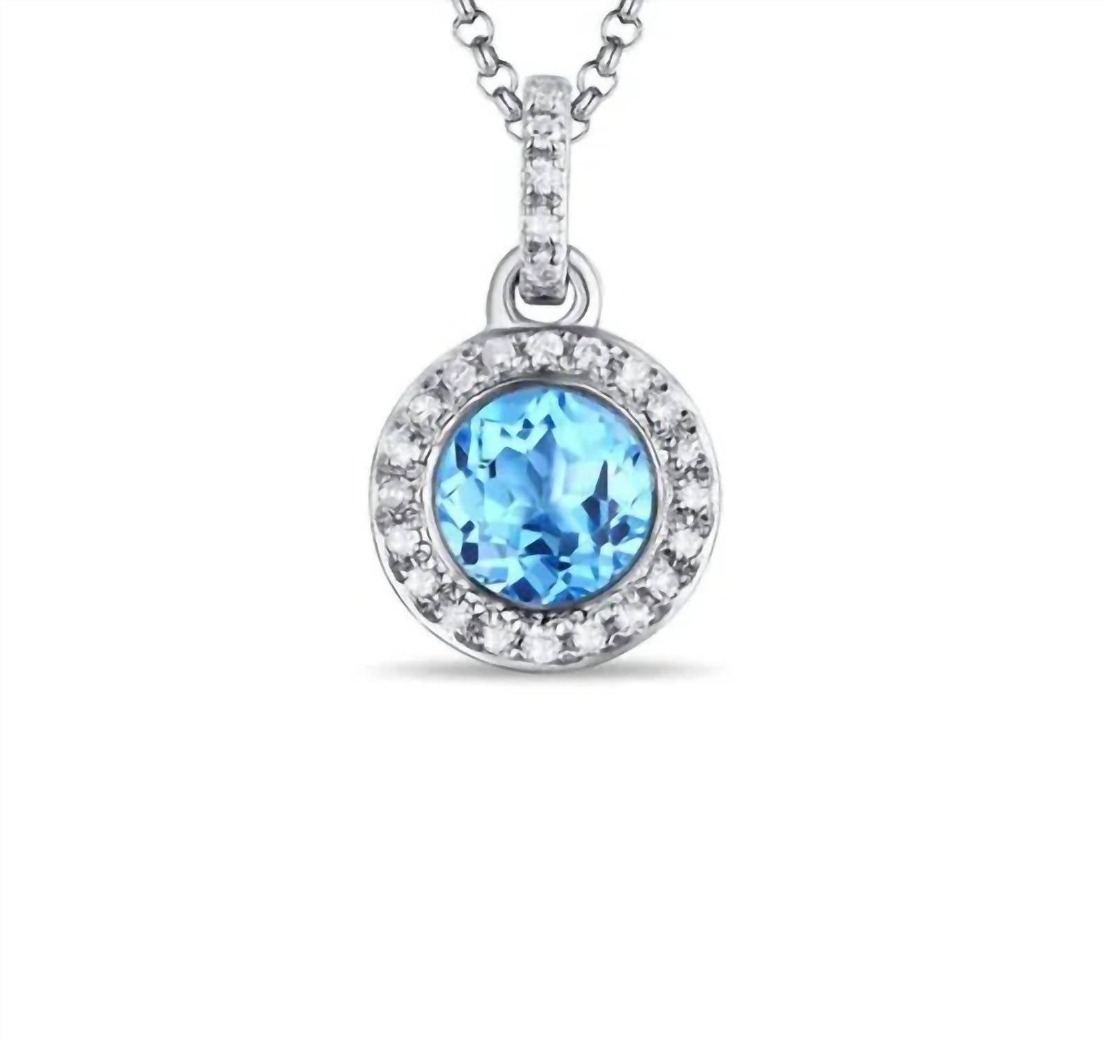 Introducing the 0.75 Cts Blue Topaz Diamond Pendant by Diana M Jewels, a stunning piece crafted in elegant 14k white gold. This exquisite pendant features a 0.75 carat blue topaz center surrounded by a halo of 0.07 carats of round diamonds, adding a touch of timeless sophistication. Perfect for any occasion, this piece effortlessly elevates any ensemble with its radiant design. SKU: N01422-BT.W