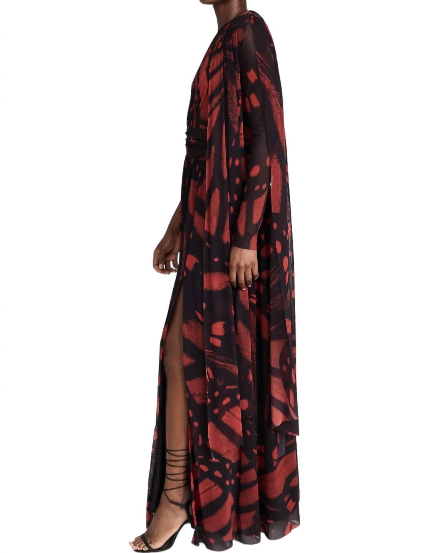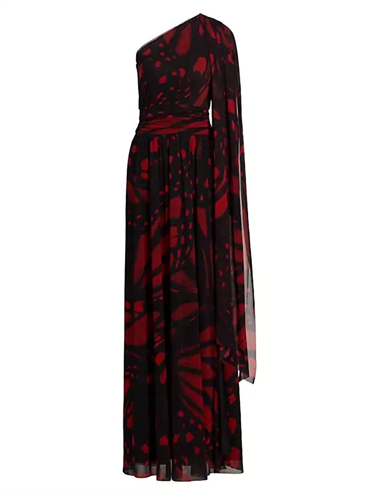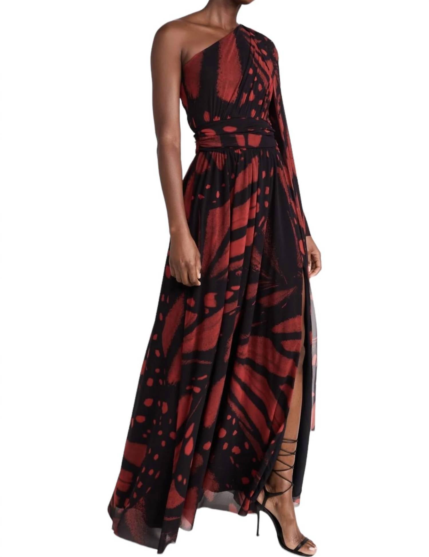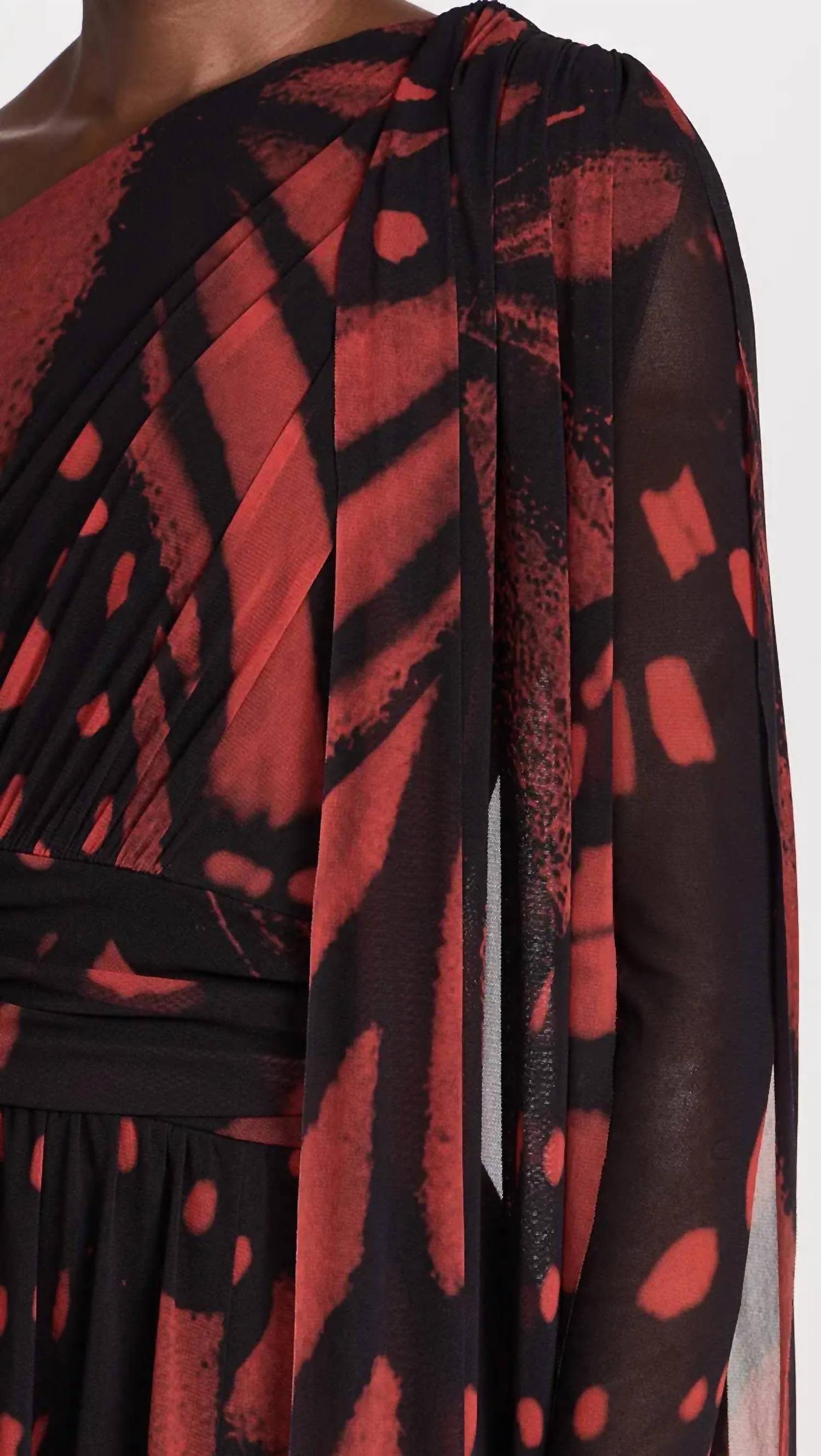 Exquisite one-shoulder. Printed tulle. Striking red and black. One-shoulder neckline. Draped scarf accent. Gathered bodice. Flattering silhouette. Thigh-high slit at the front. Abstract print in bold hues. Showcases the brand's signature artistry. Made in Italy from 100% Polyamide. Promises both luxury and comfort. Lined with a blend of Polyester and Elastane. Wash it cold or have it dry cleaned.