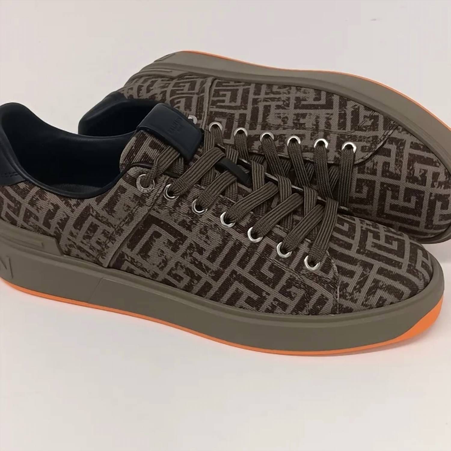 Introducing the Men's Monogram Jacquard B Court Low Top Sneakers by Balmain, striking a bold impression in green, black, and orange. These sneakers boast a trendy streetwear style perfect for spring vacations, featuring a flat heel and a classic round toe design. The low top silhouette enhances casual elegance, making it an ideal choice for various occasions. Enjoy the sophisticated craftsmanship synonymous with Balmain, designed exclusively for the modern man.