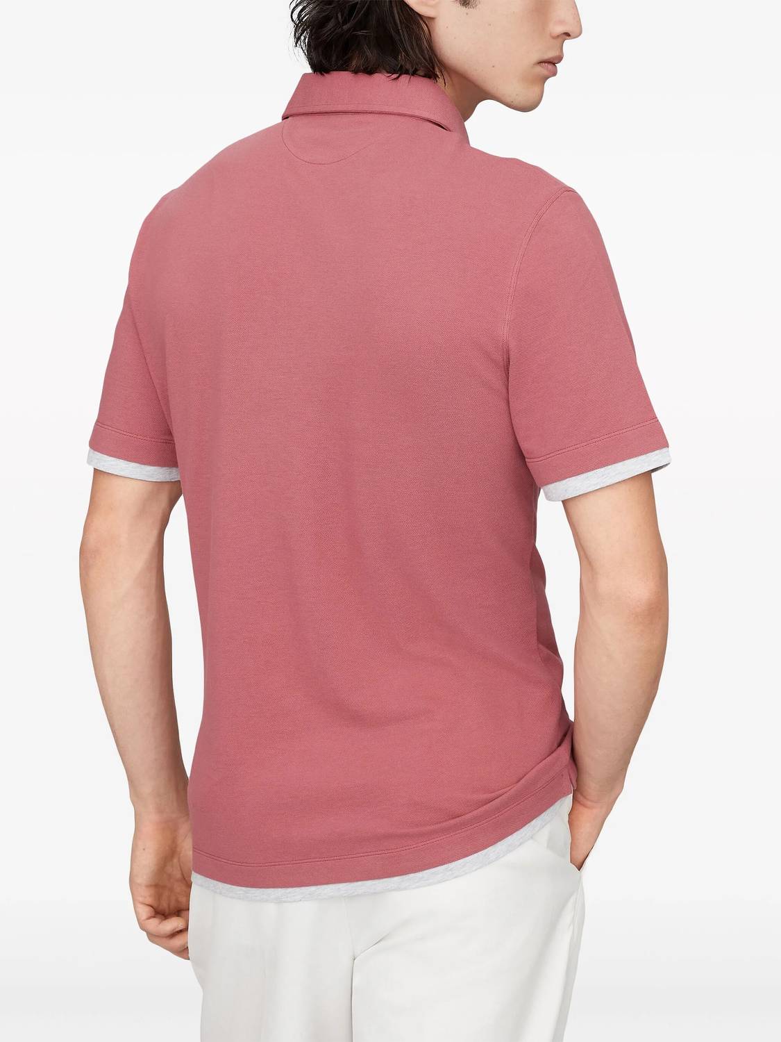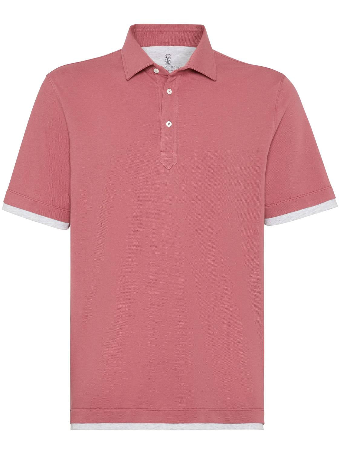 Experience the refined elegance of the Brunello Cucinelli Pique Collar Polo with Faux Layering Shirt in an exquisite salmon hue. This men's short sleeve polo is crafted from 100% cotton in a lightweight piqué with a traditional honeycomb weave, perfect for embracing spring's vibrant colors. Made in Italy, it features stylish fabric inserts on the sleeves and bottom for a striking contrast. Adorned with a shirt-style collar and a button closure, this non-activewear piece is ideal for travel or professional settings.