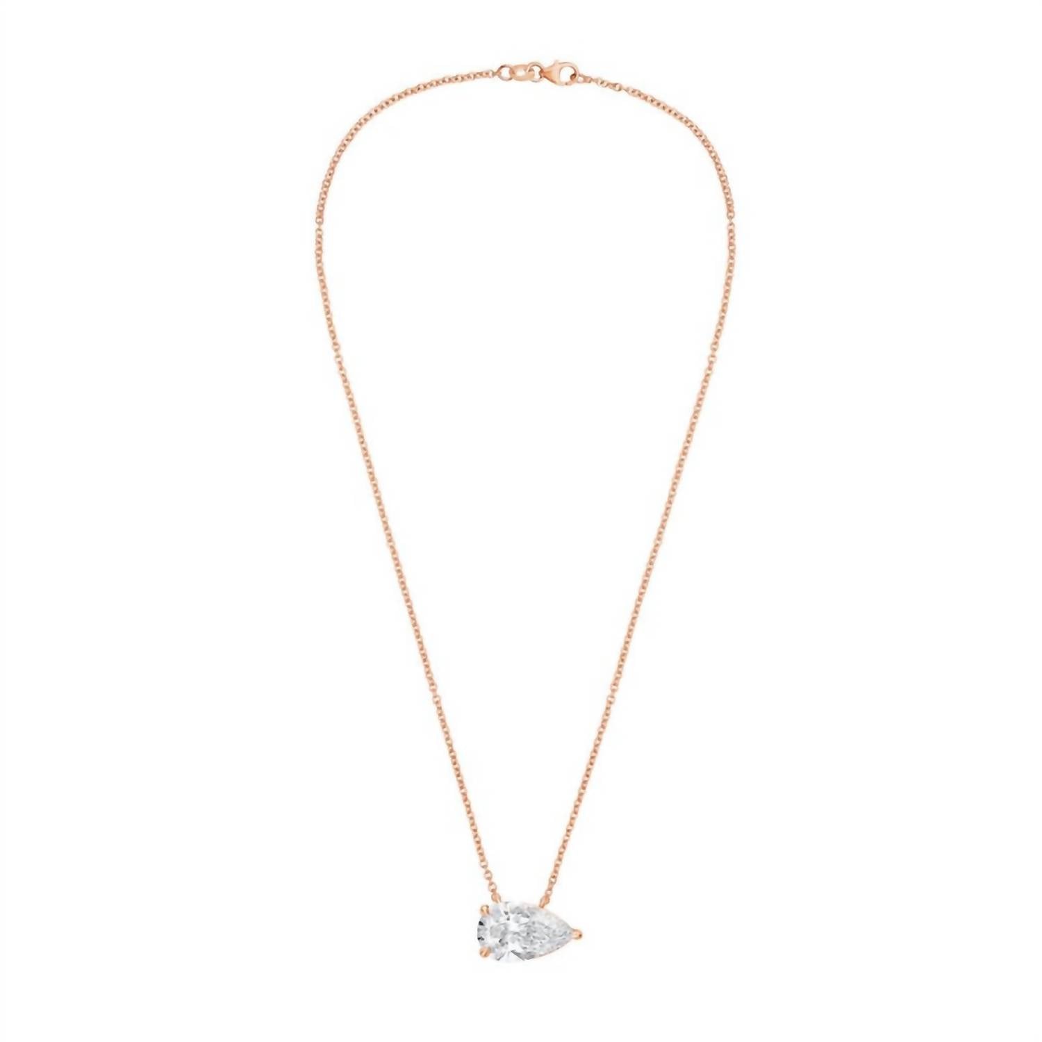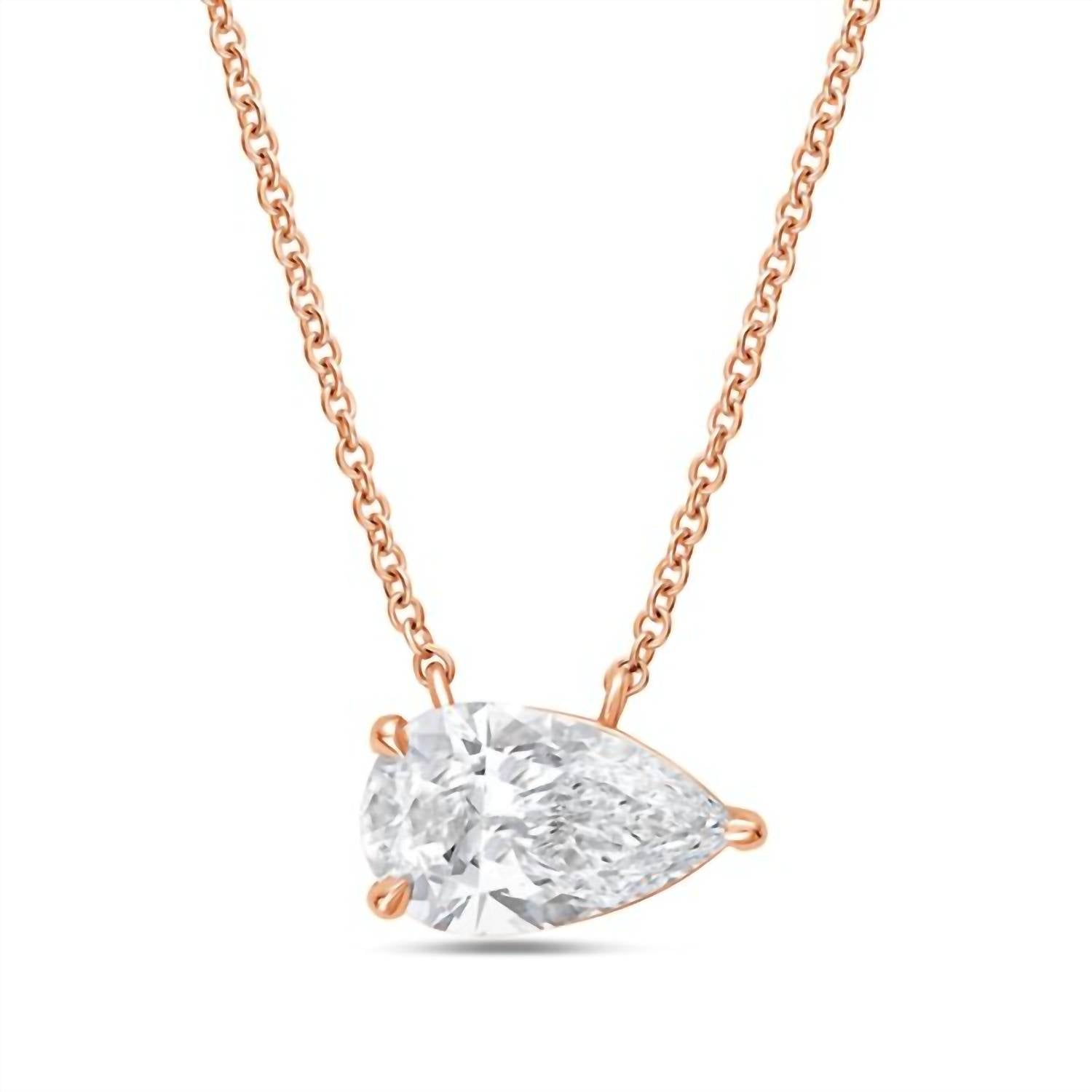 This stunning pendant features a 3.00-carat pear-shaped lab-grown diamond set horizontally in a prong setting. The diamond’s brilliant sparkle and elegant design create a timeless piece, adding a touch of sophistication to any collection.