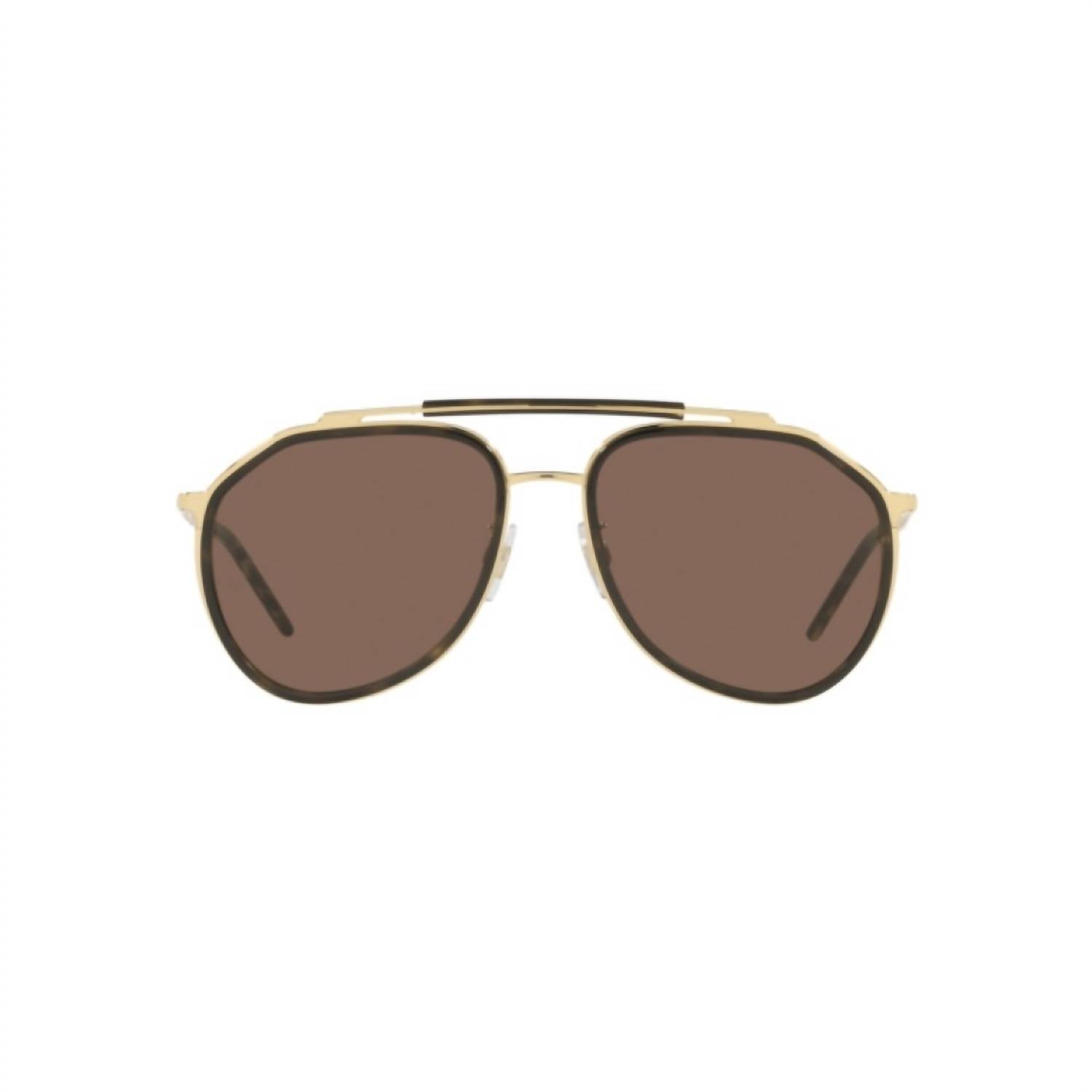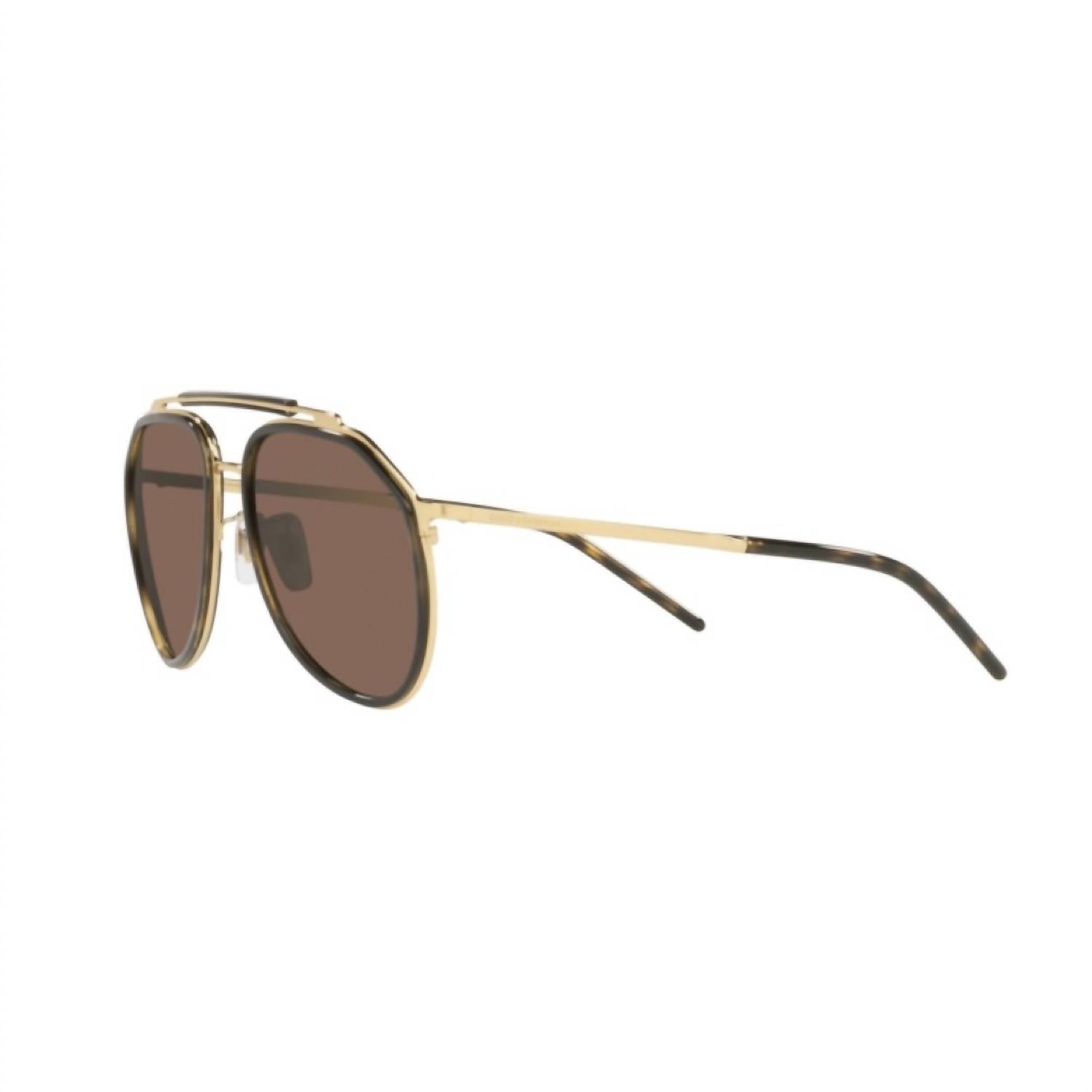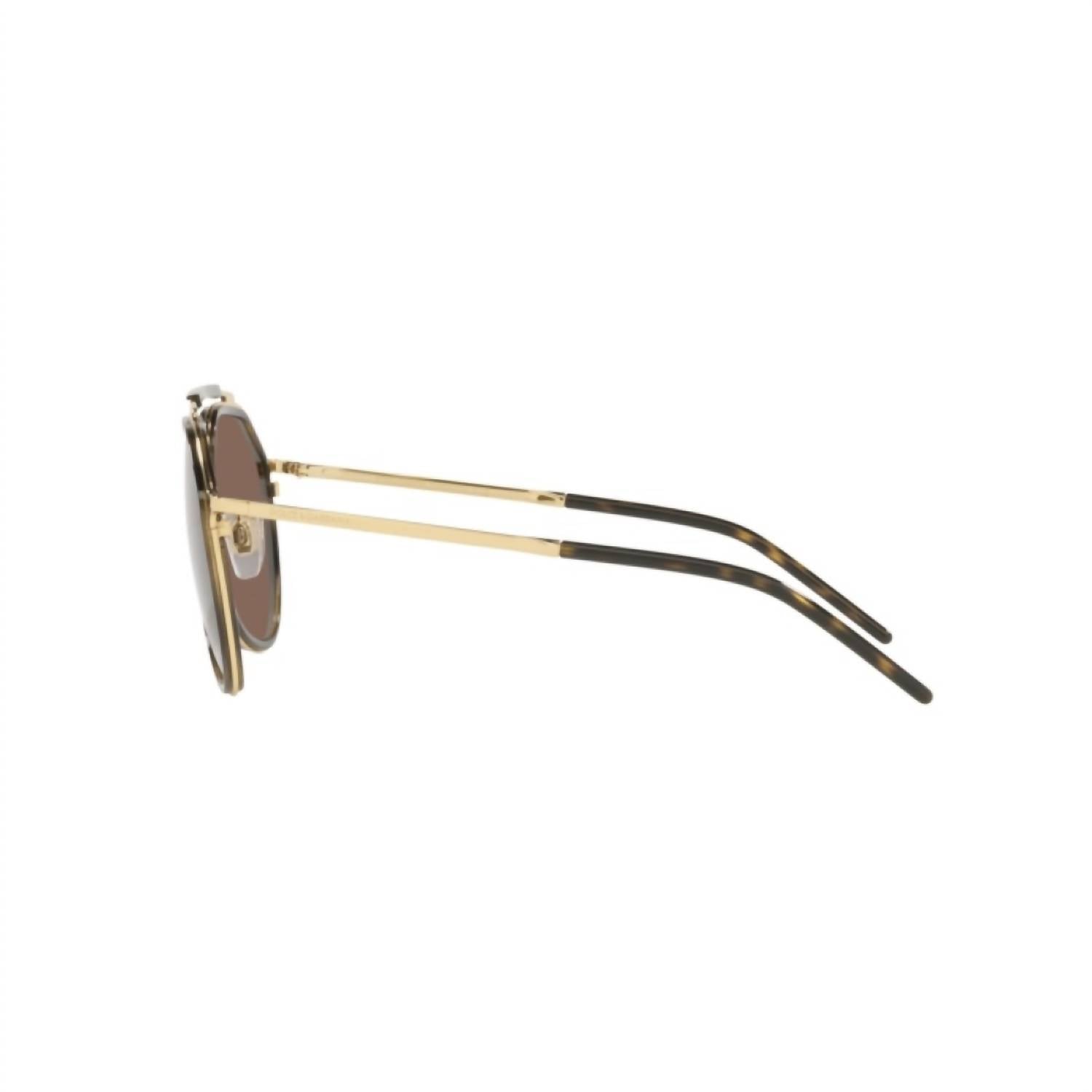 Experience luxury with the Men's DG2277-0273 Sunglasses by Dolce & Gabbana, designed in a timeless aviator style. Crafted in Italy, these glasses feature a sleek gold/havana metal frame paired with dark brown plastic lenses for a sophisticated look. Dimensions include a bridge width of 18mm, rod length of 140mm, lens length of 57.3mm, and lens height of 52.3mm, offering a comfortable fit. The lens base is Base 4, ensuring optimal sun protection and clarity.