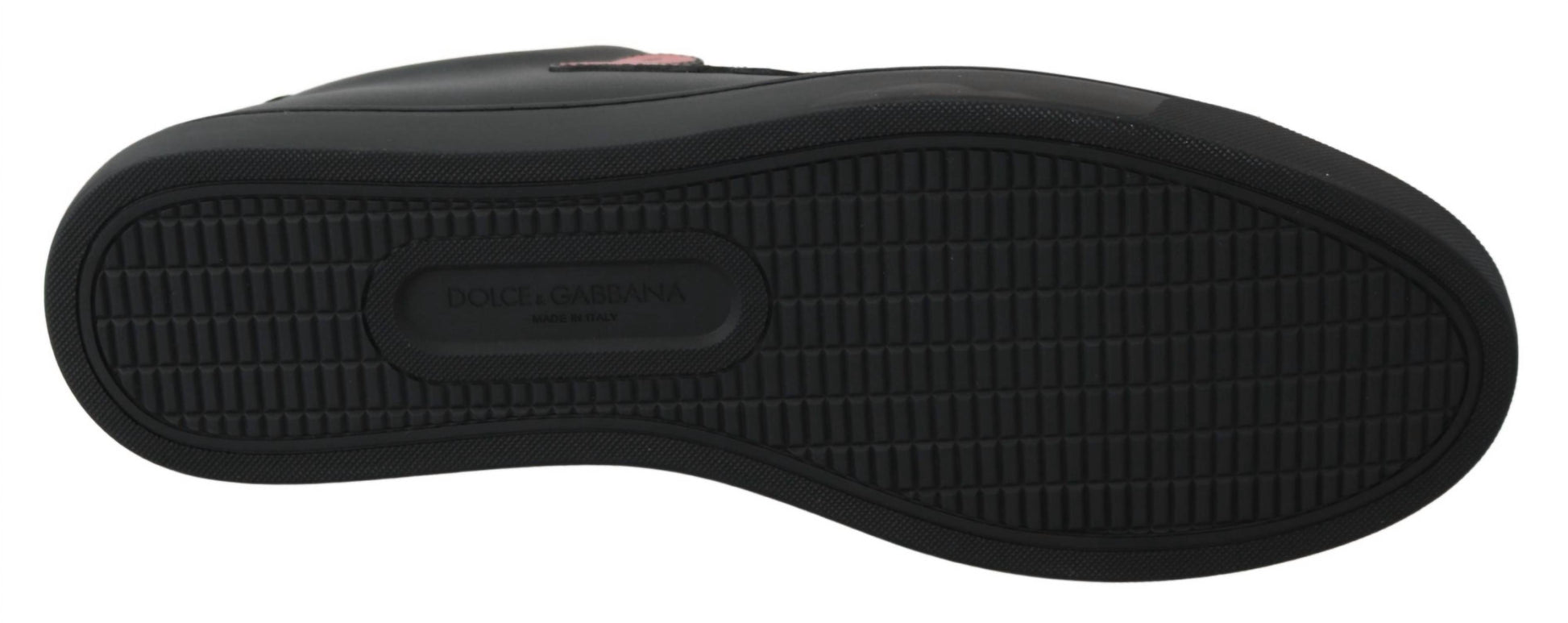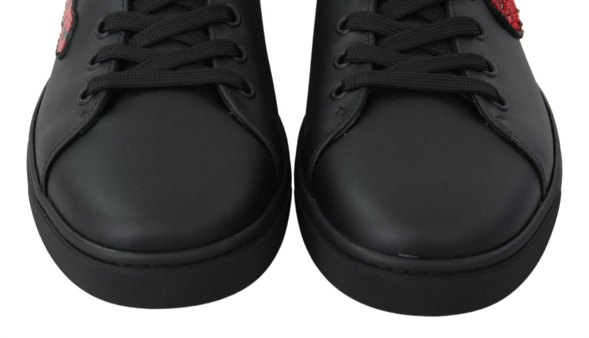 Cute, functional, and comfortable. These sneakers check all the boxes. Step into style with the Women's Love Heart Sneakers by Dolce & Gabbana, featuring a luxurious 100% leather build. These sneakers boast a chic black color with striking red detailing and a playful red sequined heart, all sitting atop a durable rubber sole. Designed with a round toe and flat heel, these minimalist sneakers are perfect for any spring adventure. Made in Italy, they embody both quality and elegance.