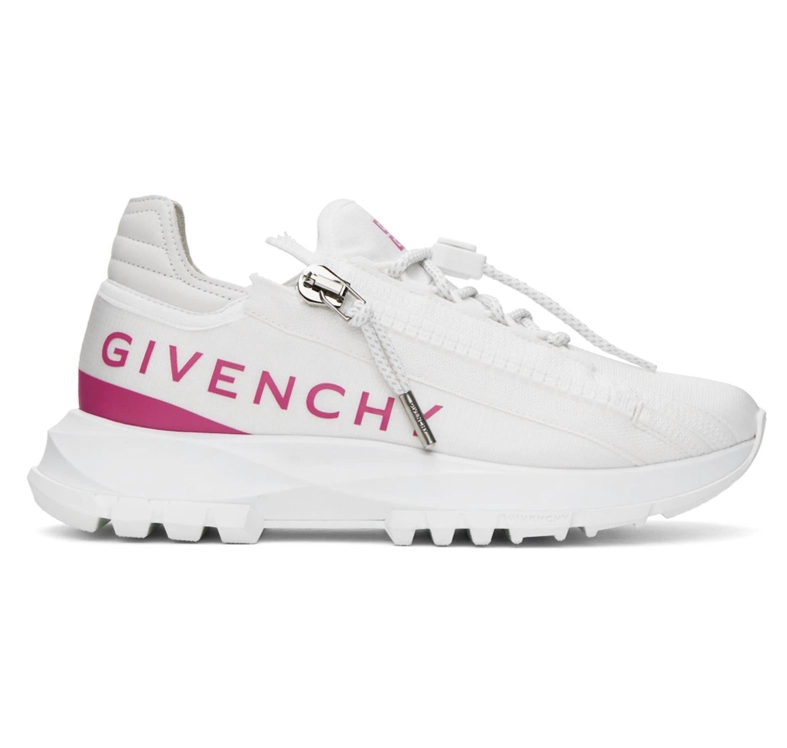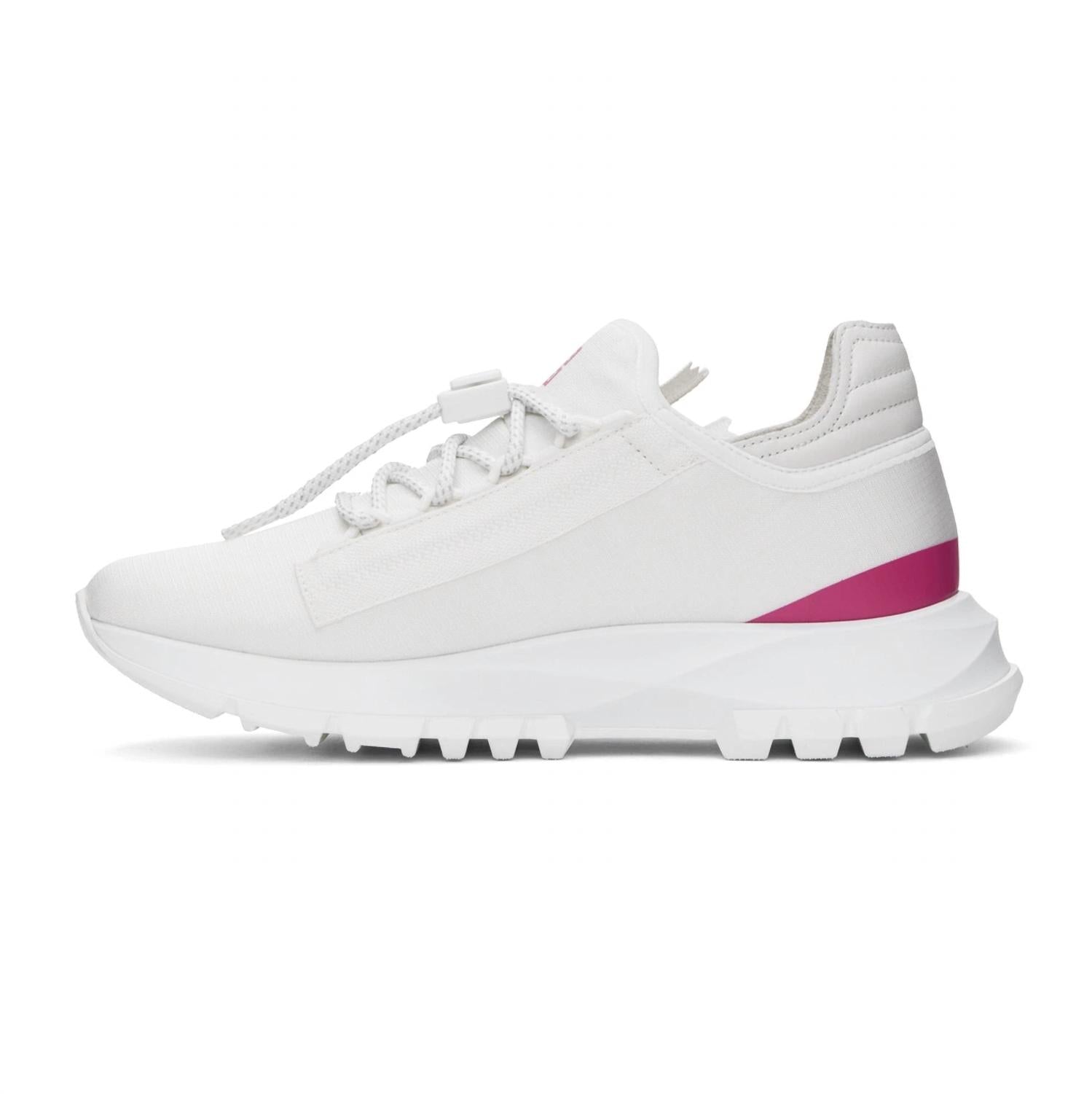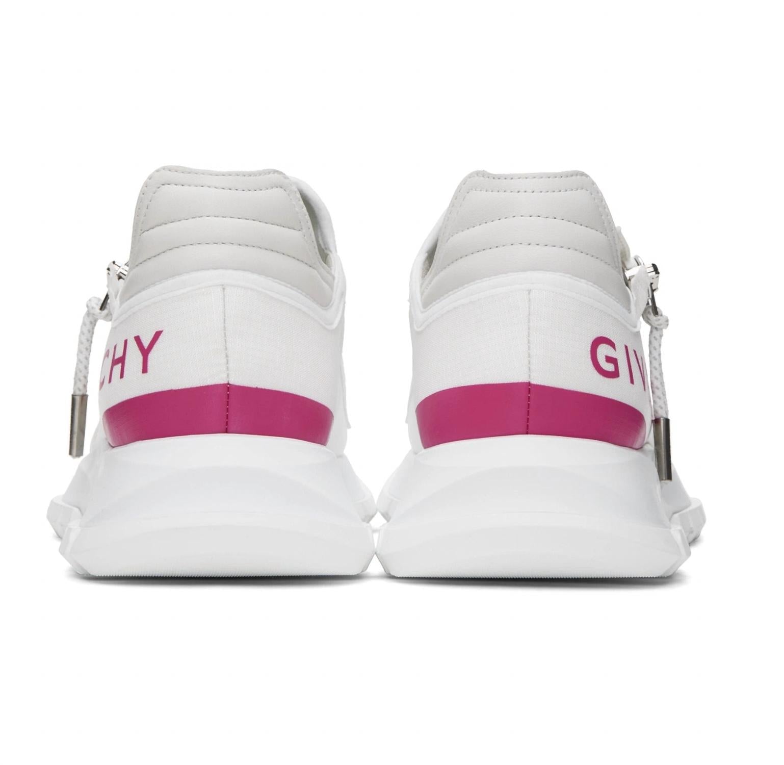 Cute, functional, and comfortable. These sneakers check all the boxes. Step into style with the Women's Spectre Runner Low Top Sneakers by Givenchy, a chic addition to your athleisure lineup. These white and fuchsia sneakers boast a unique ripstop design and a convenient cord-lock drawstring at the vamp. They feature a zip closure on the outer side and are crafted from luxurious leather with a quilted buffed leather collar for added comfort. The suede and bonded jersey lining complements the embossed treaded rubber sole, showcasing the brand's iconic logo for a fashionable finish.