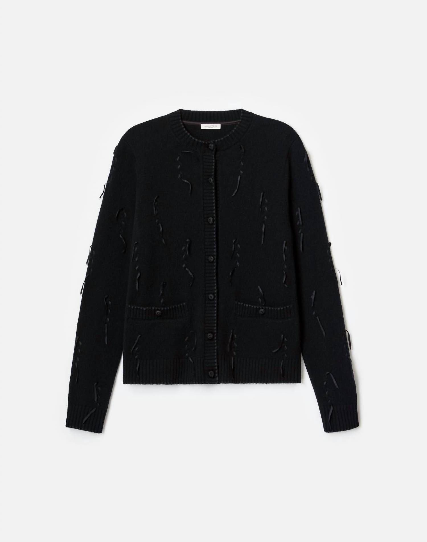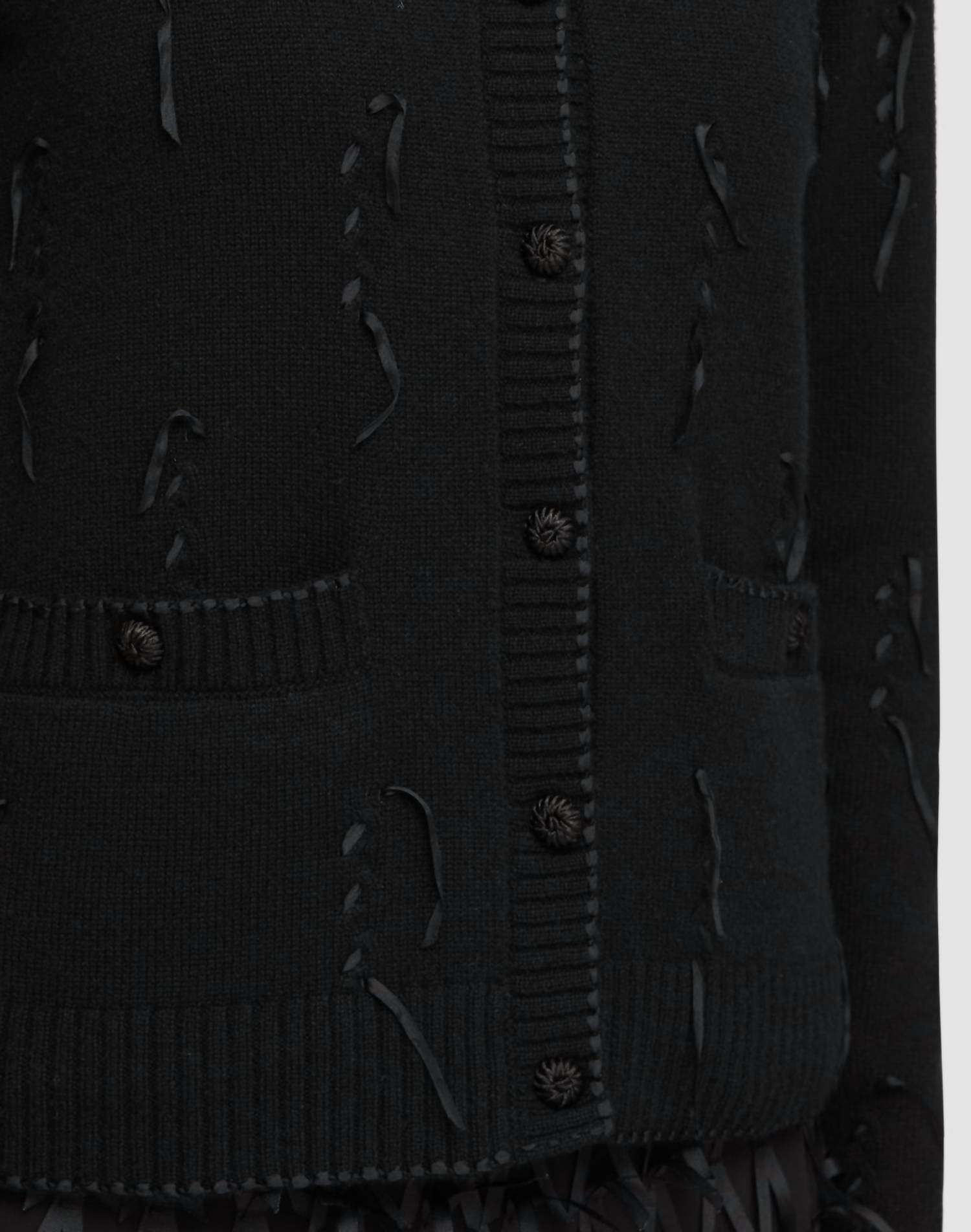 This cardigan will be a sweater-rotation favorite. Embrace elegance with the Hand Embellished Ribbon Cashmere Cardigan by Lafayette 148, perfect for travel and New Year's Eve occasions. This black cardigan is crafted from 100% ultra-soft cashmere with slim long sleeves and a crewneck, showcasing hand-embellished silk ribbons and a stylish cable-knit design. It features knit-in welt pockets and a delicate button closure with soutache details. For best care, dry clean is recommended. Imported.