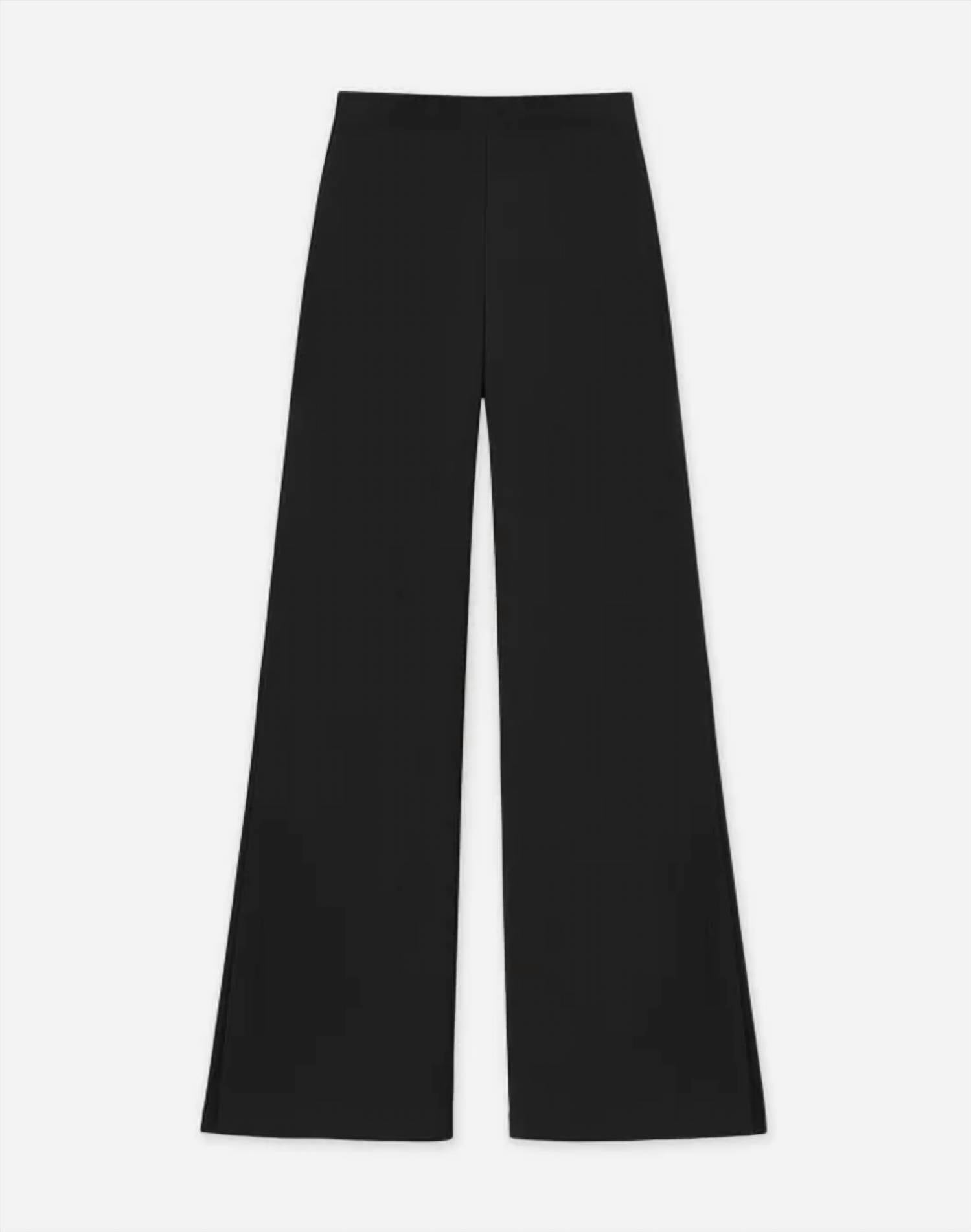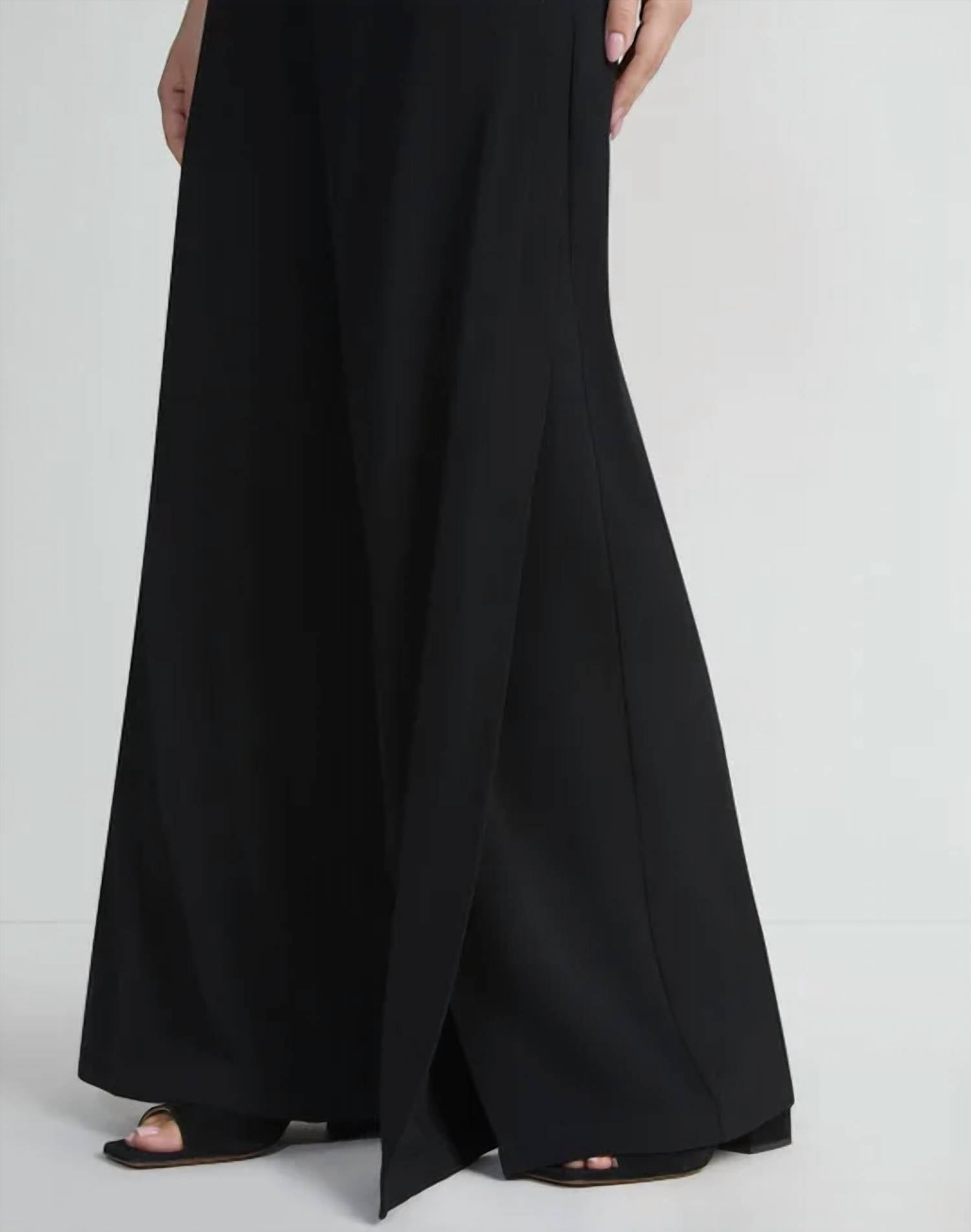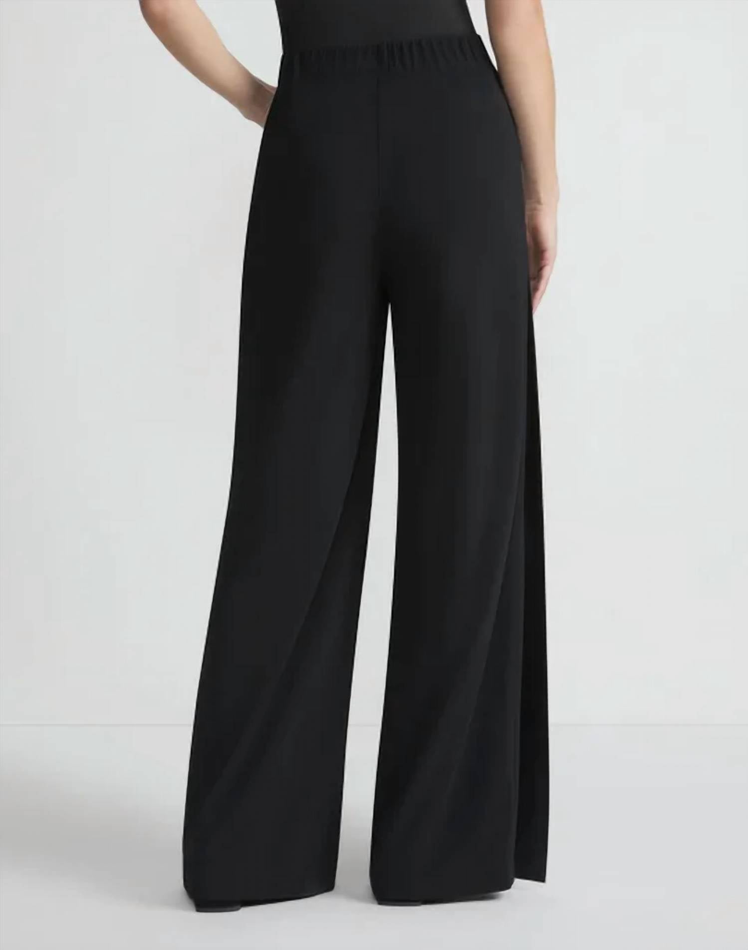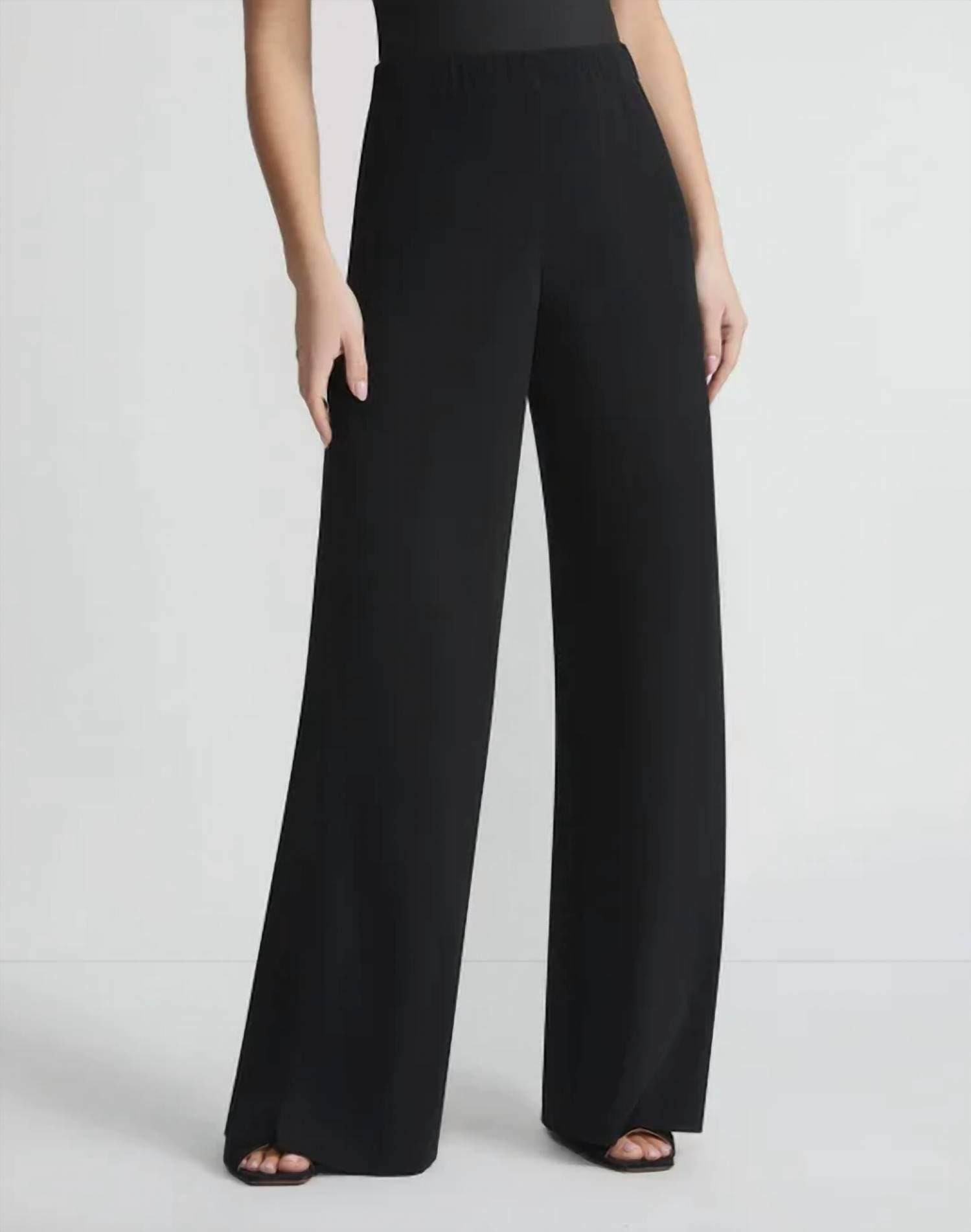 Elevate your holiday party look with the Matte Jersey Franklin Pant by Lafayette 148, crafted in a sophisticated black 96% Viscose 4% Elastane blend. These full-length, wide-leg pants feature a relaxed fit with a high-rise pull-on elasticized waistband and seam pockets, perfect for a preppy spring occasion. They are thoughtfully designed with a front overlay and open sides, ensuring a striking silhouette. Imported and easy to care for, simply dry clean this stylish piece, available in multiple sizes including a 31" inseam and varying leg openings for the ideal fit.
