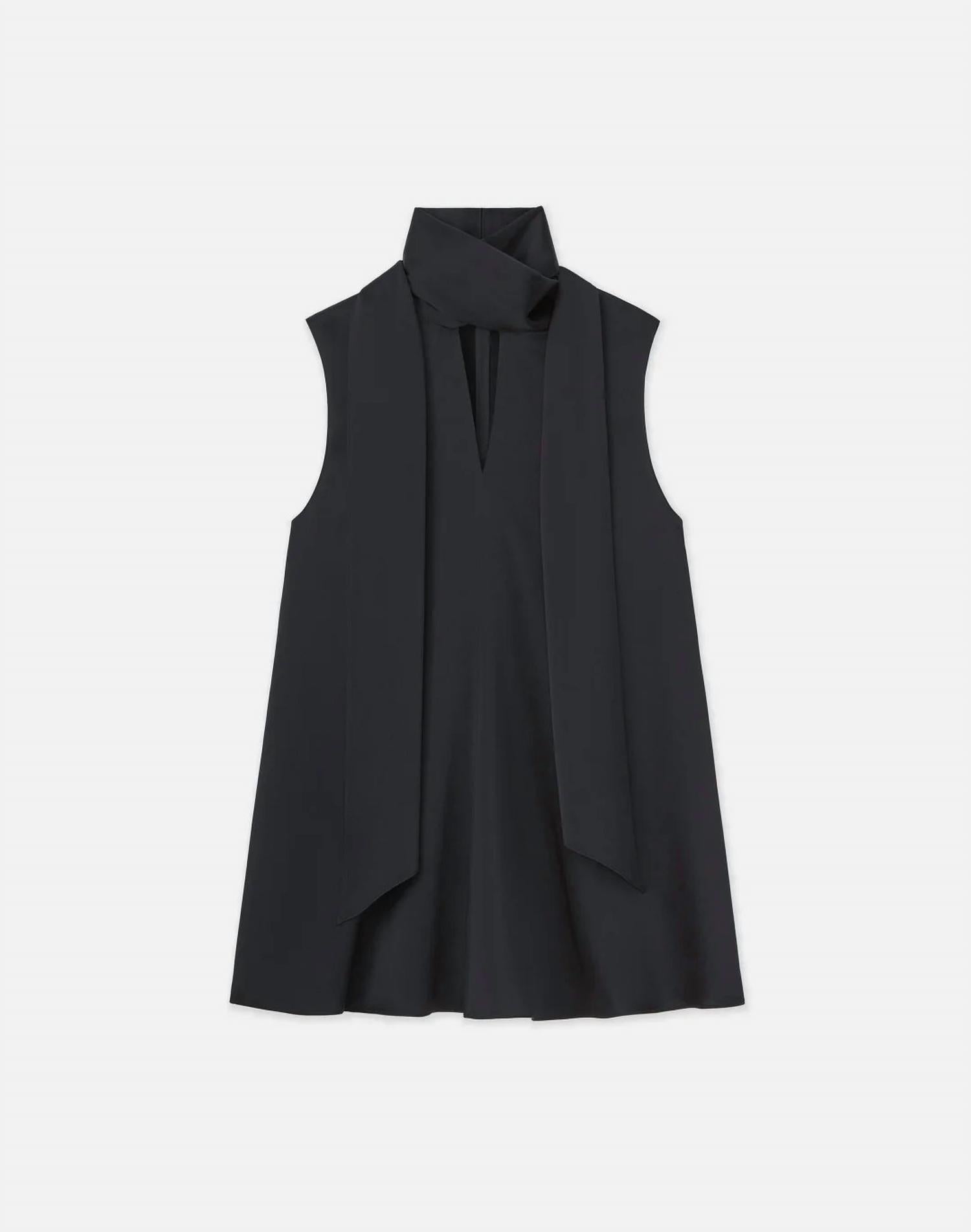A timeless blouse that will never go out of style. Flared silhouette Slit neck, scarf tie collar Sleeveless Pullover Low hip length 100% Silk; Imported Dry clean only