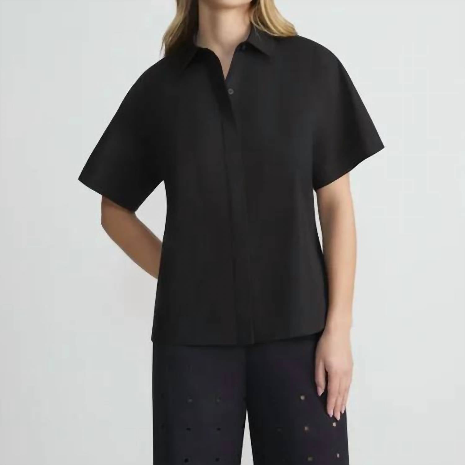 A classic button down shirt that will never go out of style. Discover the Lafayette 148 Short Sleeve Shirt, a refined piece for your summer wardrobe. Crafted from perfected 100% Cotton Poplin, this shirt features crisp construction with organic fibers. The squared sleeves and box silhouette provide a relaxed shape, complemented by a point collar and hidden button placket. Available in solid black, this piece seamlessly blends sartorial polish with a preppy aesthetic.
