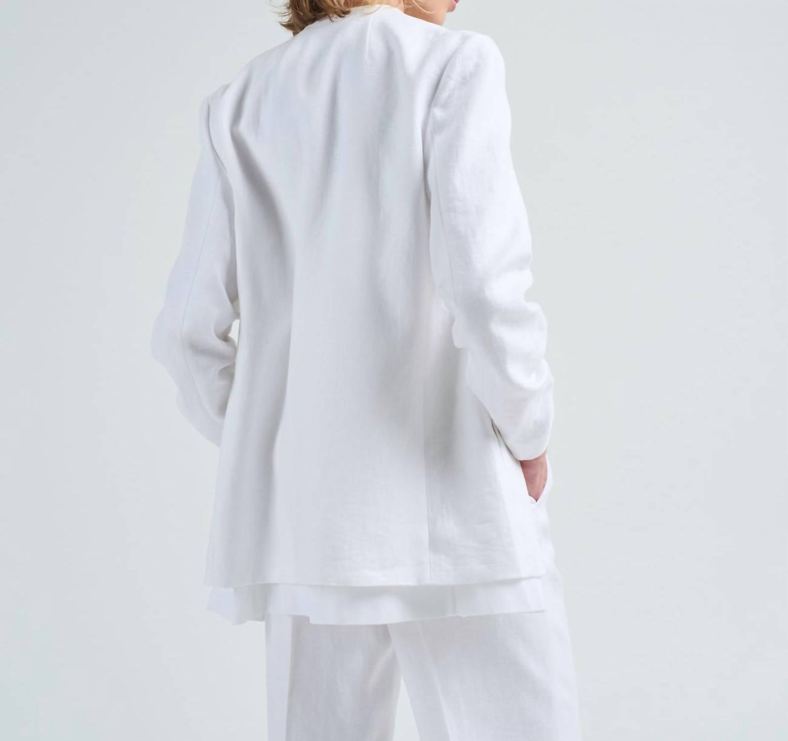 Tailored to perfection, this blazer will be your go-to jacket for years to come. This white blazer is tailored from 100% linen in a straight fit with a V-neckline and open front. Designed with 3/4 ruched sleeves, it features interior patch pockets for subtle function and comes with a detachable cotton voile vest for versatile styling.