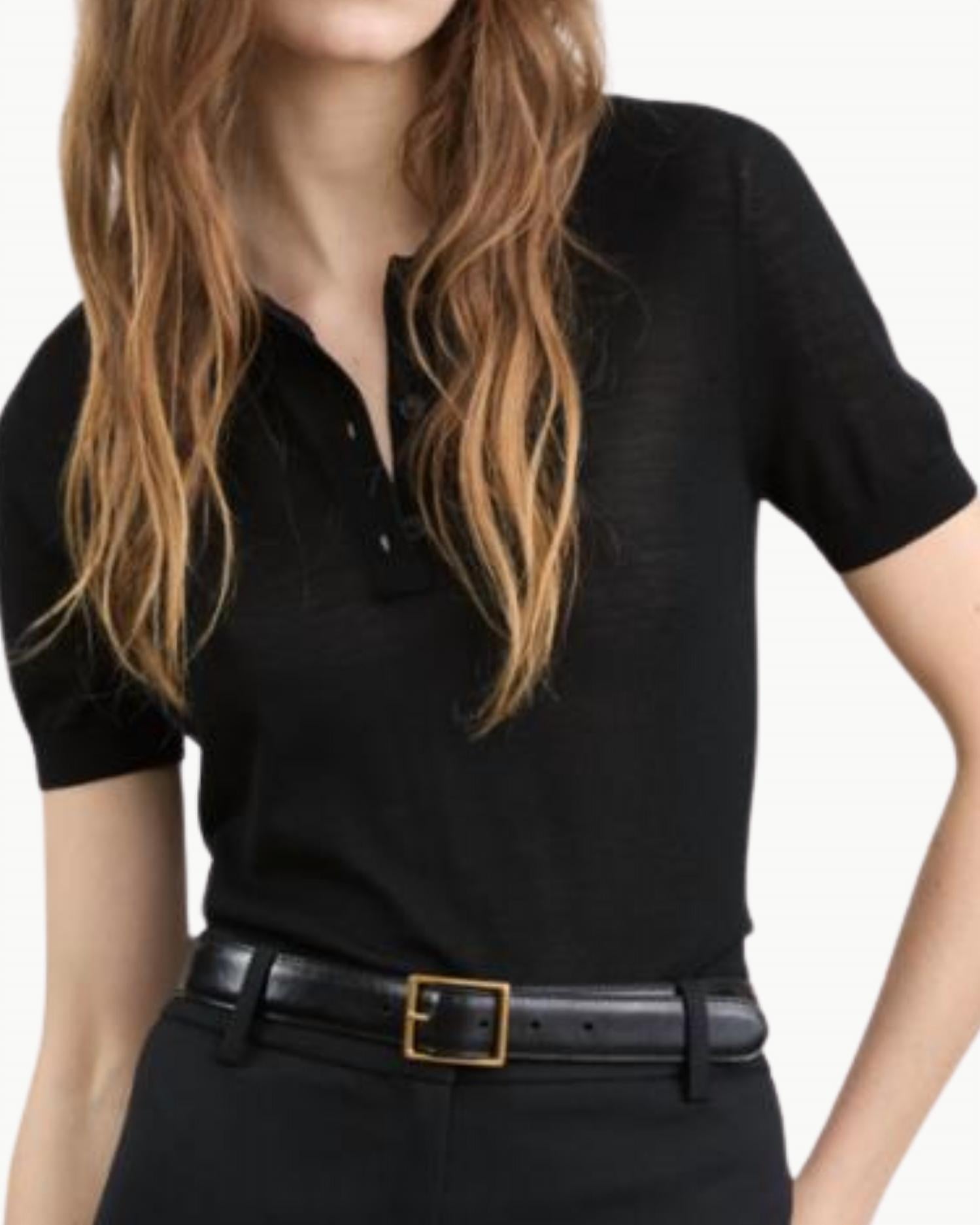 The ultimate go-to sweater, expertly crafted to provide the perfect combination of warmth and style. Its classic design and soft fabric make it a must-have addition to your wardrobe. Discover the Jeannelle Short-sleeve Sweater by Nili Lotan, a luxurious piece crafted in a soft wool blend of 80% Merino Wool and 20% Cashmere. This short-sleeve sweater in timeless black offers a flattering V-neck and relaxed fit, ideal for a minimalist style at a dinner party. The button closure adds a touch of sophistication to this solid-patterned garment. Perfect for spring wear, it embodies both comfort and elegance.