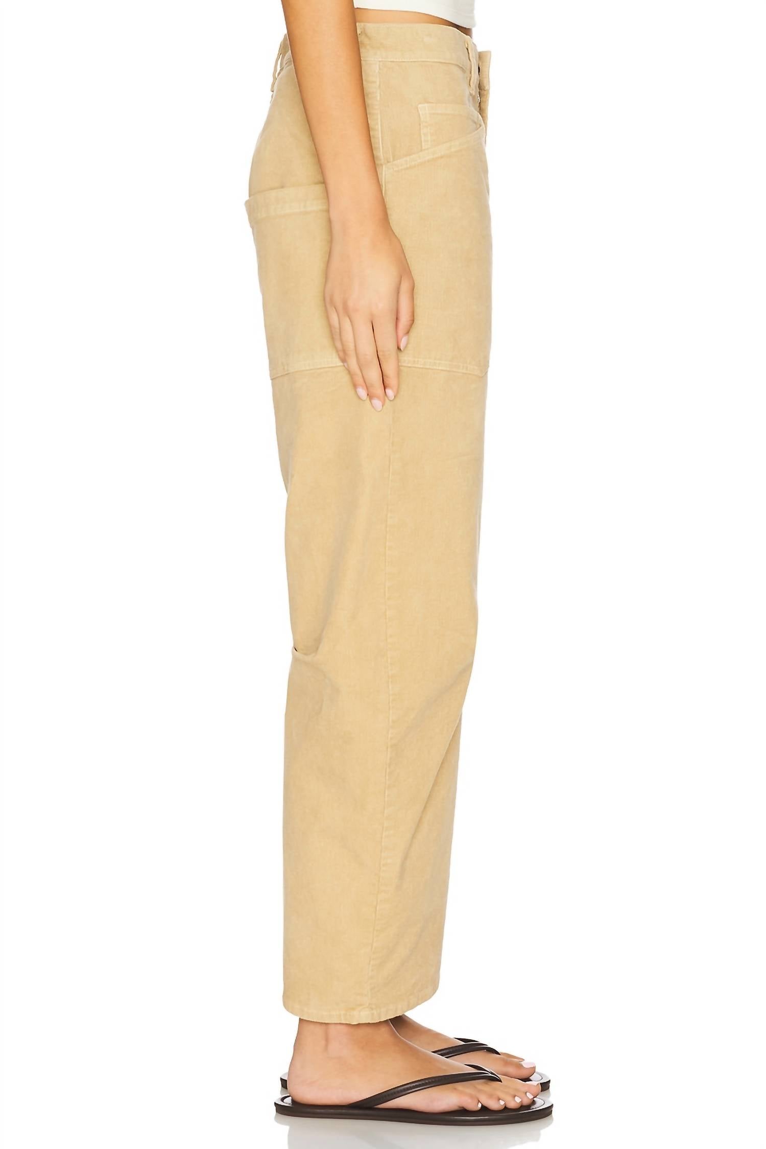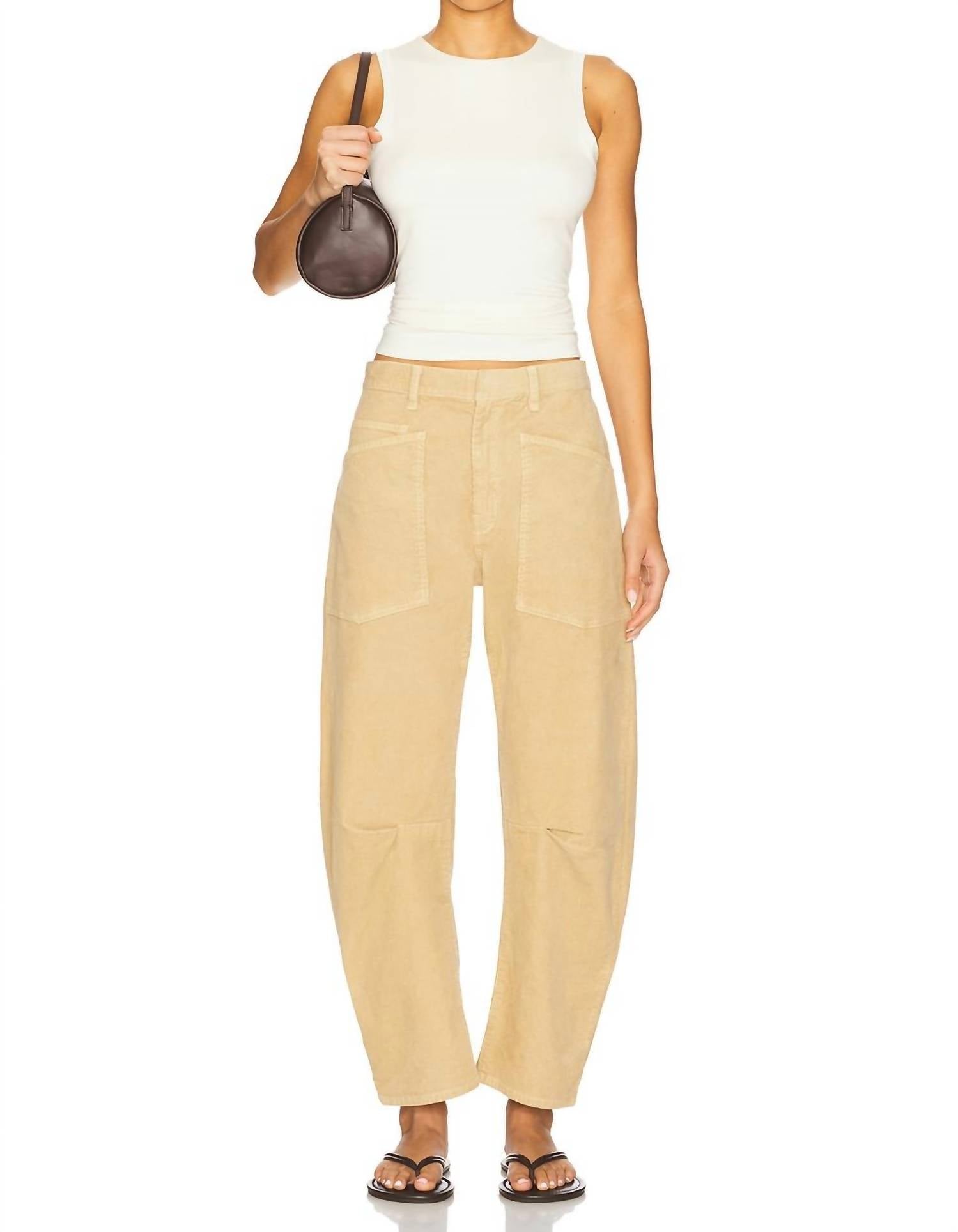 This straightleg pant is both stylish and comfortable. Did we mention the fit is perfection? Elevate your wardrobe with the Shon Cord Pants by NILI LOTAN, designed in the sophisticated Sabbia shade. These mid-rise pants offer a relaxed fit with a barrel leg style, featuring a uniquely curved silhouette and seam detail at the knees. Crafted in the USA from a cotton blend, they include top-stitched front and back patch pockets, belt loops, and a practical zip fly with a hidden hook-and-bar and button closure. Care is effortless: machine wash cold, tumble dry low, and low iron without worry of bleach or dry cleaning. Designed for a 26.3" inseam, these pants capture the essence of 90s fashion, making them perfect for spring travels and New Year's Eve celebrations.