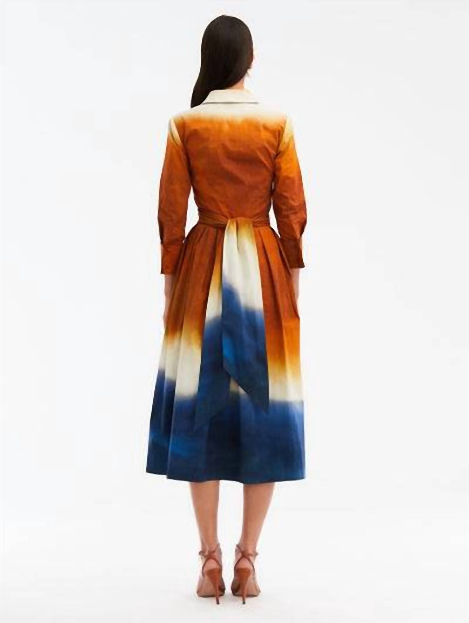 The perfect length dress does exist. Elevate your wardrobe with the Long Sleeve Wrap-Detailed Abstract Ombre Poplin Dress by Oscar de la Renta, a stunning choice for dinner parties this fall. This exceptional piece, crafted in Italy, features a three-quarter sleeve design with an ombre pattern and a flattering crossover waist detail. Made from a blend of 97% cotton and 3% elastane, it ensures a comfortable fit. Closure: Button closure. Care: Dry clean only.