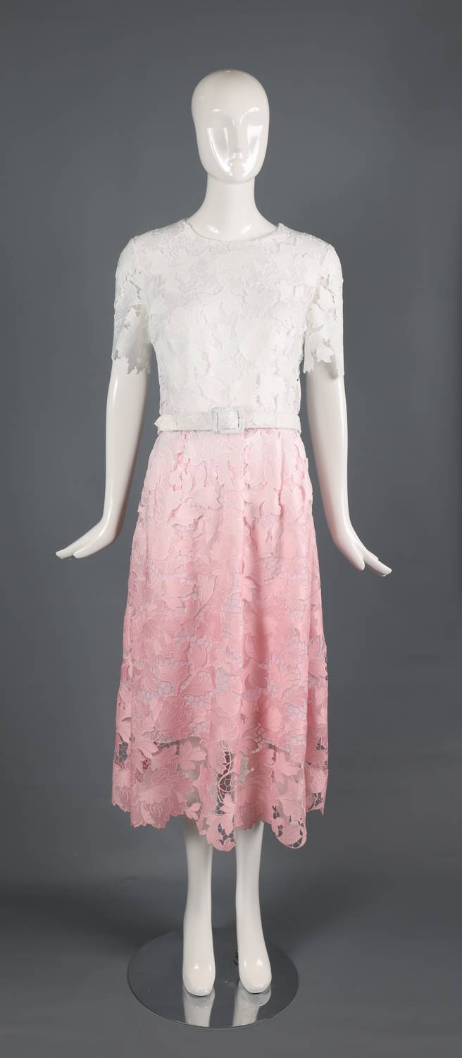 Just add slides or mules and you are good to go. Embrace sophistication with the Elegant Two-tone Lace Midi Dress by Oscar de la Renta, perfect for your next anniversary celebration or Valentine's Day event. This A-line silhouette dress in soft pink and white features a textured pattern and a classic crewneck, offering a timeless look. Designed with short sleeves, it's an ideal choice for the fall season, embodying the trend of quiet luxury. Made for women, this dress beautifully combines elegance with a refined aesthetic.