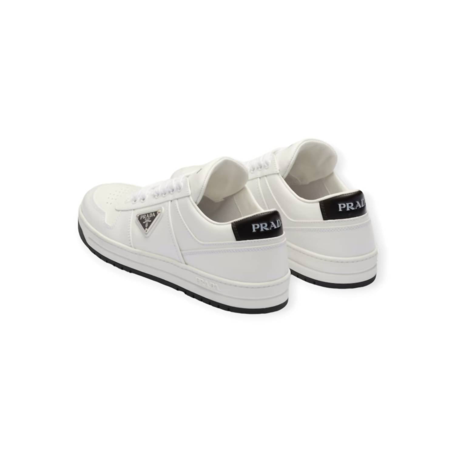 When fashion and function come together seamlessly. Experience sporty elegance with the Women's Downtown Perforated Leather Sneakers by Prada, crafted for the modern traveler. Featuring a perforated upper and a 30 mm rubber sole with a geometric tread, these sneakers offer both style and comfort. The leather lining is complemented by a removable leather-covered insole, and the design is finished with an enameled metal triangle logo for a touch of luxury. Closure: Cotton laces. Ideal for spring streetwear, these sneakers feature a round toe and flat heel, perfect for casual outings.