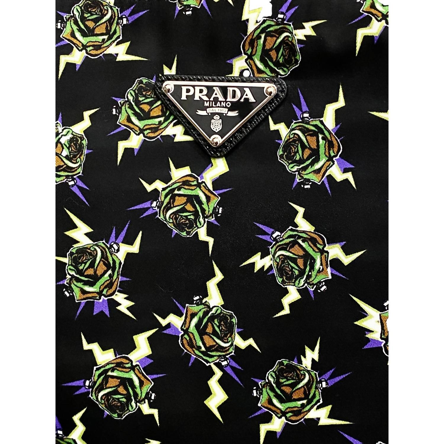 Aside from being the cutest bag ever, this tote is the perfect size to hold all of your vacation necessities. Pair this adorable bag with a flowing dress and some slides and you're all set! Introducing the Prada Women's Frankenstein Nylon Convertible Shopping Tote, a striking tote featuring a unique Frankenstein rose print on black tessuto nylon. Made in Turkey, this tote combines luxury and practicality with a secure top zip closure and spacious interior storage, including an interior zip pocket and patch pocket. Designed with silver-tone hardware, 10-inch drop handles, and a removable fabric shoulder strap with a 17-inch drop for versatile carrying options. Dimensions: 16.5 x 6 x 14 inches (LWH). Comes complete with authenticity cards and a Prada dust bag.