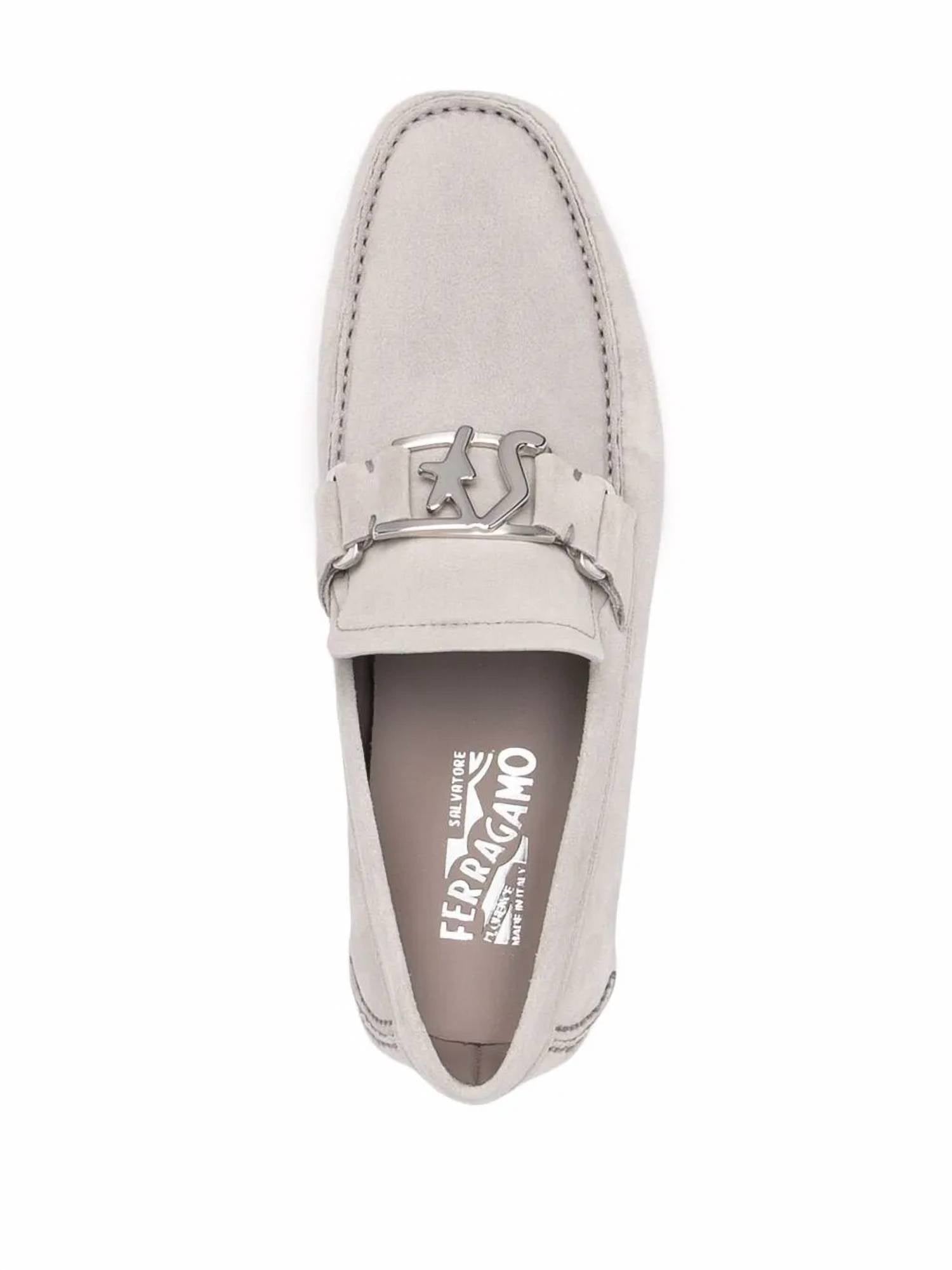 Introducing the Salvatore Ferragamo Peter Logo-Plaque Loafers, expertly crafted for refined elegance. Made in Italy, these grey loafers feature a round toe and a silver-tone logo plaque for a touch of sophistication. The composition includes 100% calf suede outer and sole, complemented by a 100% leather lining, ensuring both comfort and luxury. Designed with a flat rubber sole, these loafers effortlessly combine style and versatility, perfect for a minimalist spring dinner party look.