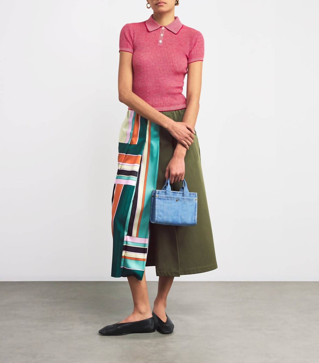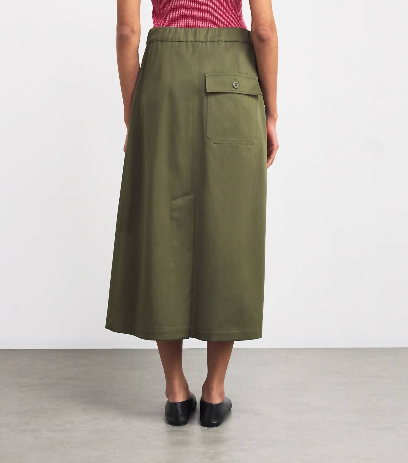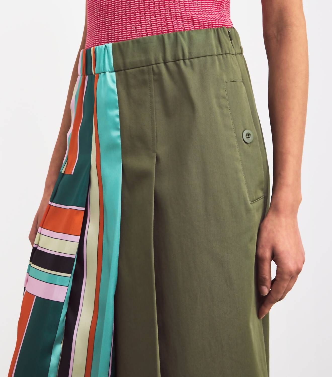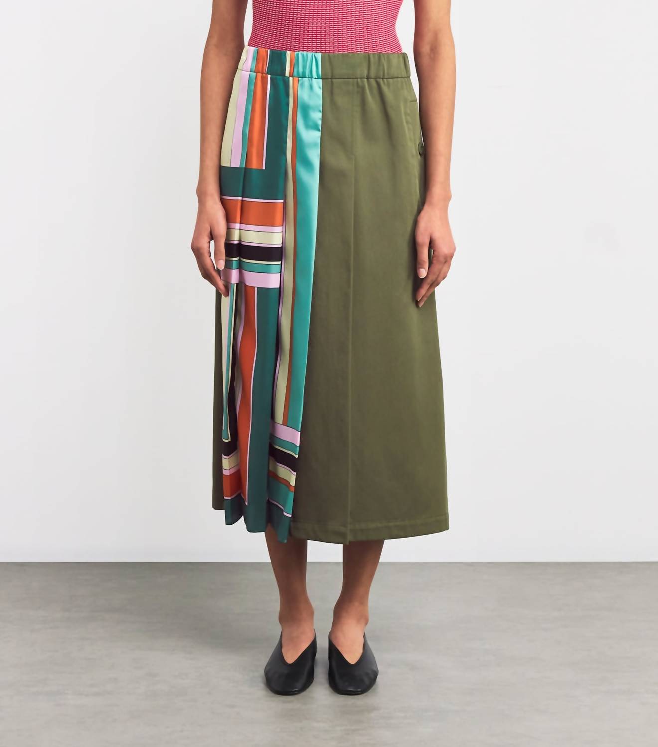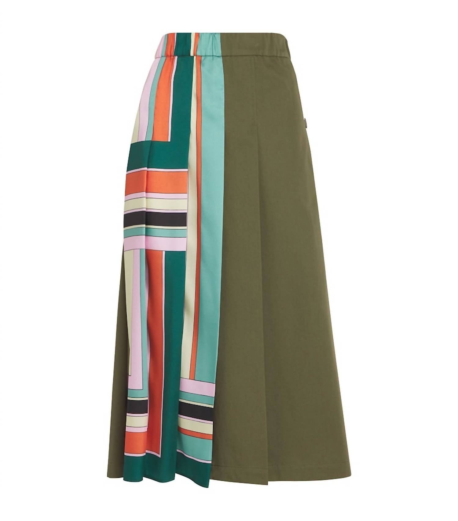 Tuck your favorite tee into this midi length skirt for an effortlessly cool look. Discover the Lallo Cotton Printed Midi Skirt by Weekend Max Mara, a vibrant addition to your wardrobe with a geometric print and stripe pattern. This midi-length skirt is made from 100% cotton with polyester trims and features a playful, colorful pleated panel at the front that contrasts with utilitarian khaki. Designed for convenience, it includes one back patch pocket and one side slip pocket with an elasticated waist for comfort and a pull-on style. Care instructions recommend dry cleaning, ensuring your piece maintains its vibrant hues and premium feel. The model is 178 cm, a UK 8, and wears a size IT 40.