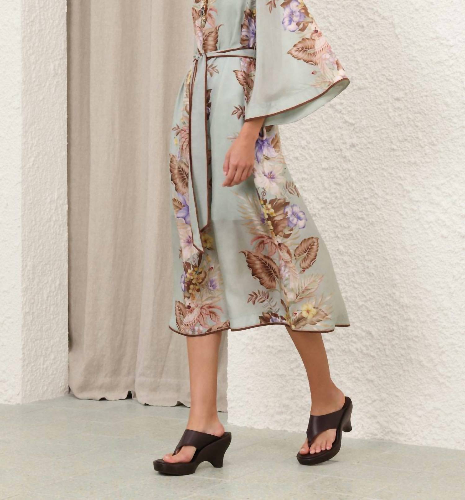 The perfect length dress does exist. The Coco Tunic Midi Dress by Zimmermann is an elegant choice for an evening event, showcasing a stylish boho neckline and long sleeves. Crafted from 100% silk habutae, this shift silhouette dress comes in a sage multi flor pattern. With its pull-on closure and a self-tie waist belt, the design includes thoughtful details such as contrast piping on the hemline and side seam pockets. This dress is made for those under 5'3"/160cm, and is available with a separate slip consisting of 86% recycled polyester and 14% elastane. Care: Dry clean only (hydrocarbon), remove detachable trims prior to cleaning, and use a cool iron with a protective cloth.
