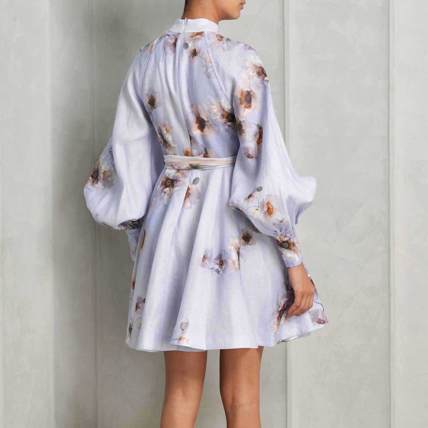 The perfect mini dress for those warmer months. Discover the Zimmermann Hypnotic Buttoned Mini Dress, an elegant choice for your spring wardrobe. This lilac poppy dress features airy long sleeves with voluminous balloon design, crafted from 100% linen for a relaxed silhouette accented by a subtle floral print. It includes a buttoned front, a zipped back, and a detachable belt, with zipped cuffs for added flair. Care for this exquisite piece with dry cleaning.