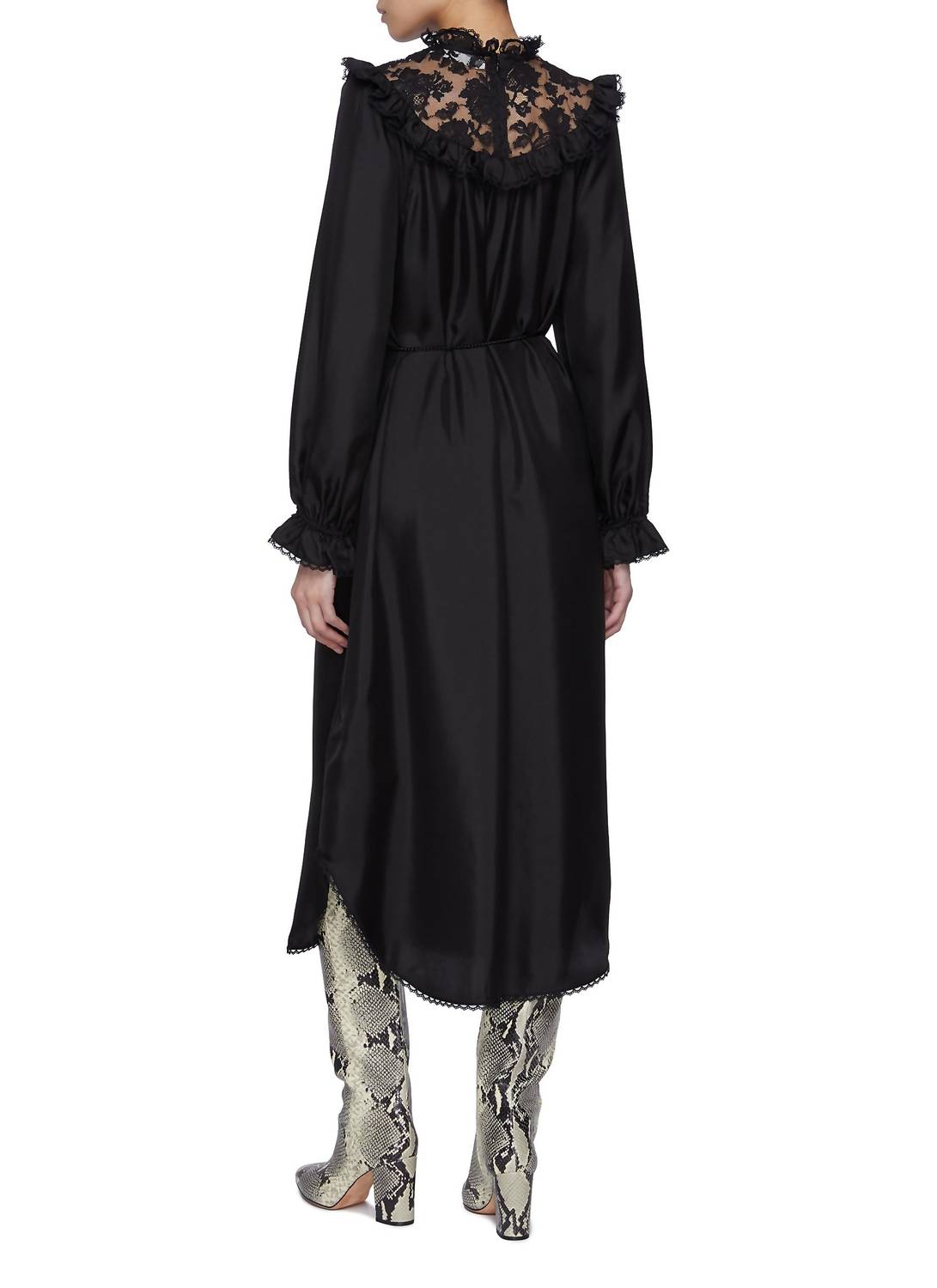 The perfect length dress does exist. The Zimmermann Lace Billow Dress in Black from the Fall 2025 Collection is the epitome of elegance and sophistication. This midi silk dress features long billow sleeves, a stand collar with ruffle trim, and artisanal lace panelling across the decolletage, accented by an asymmetrical hem trimmed with lace. Made from 100% silk, it includes an invisible zip closure at the center back and comes with a removable self-tie rope belt with fringe ends for added flair. Care instructions suggest dry cleaning for optimal maintenance.