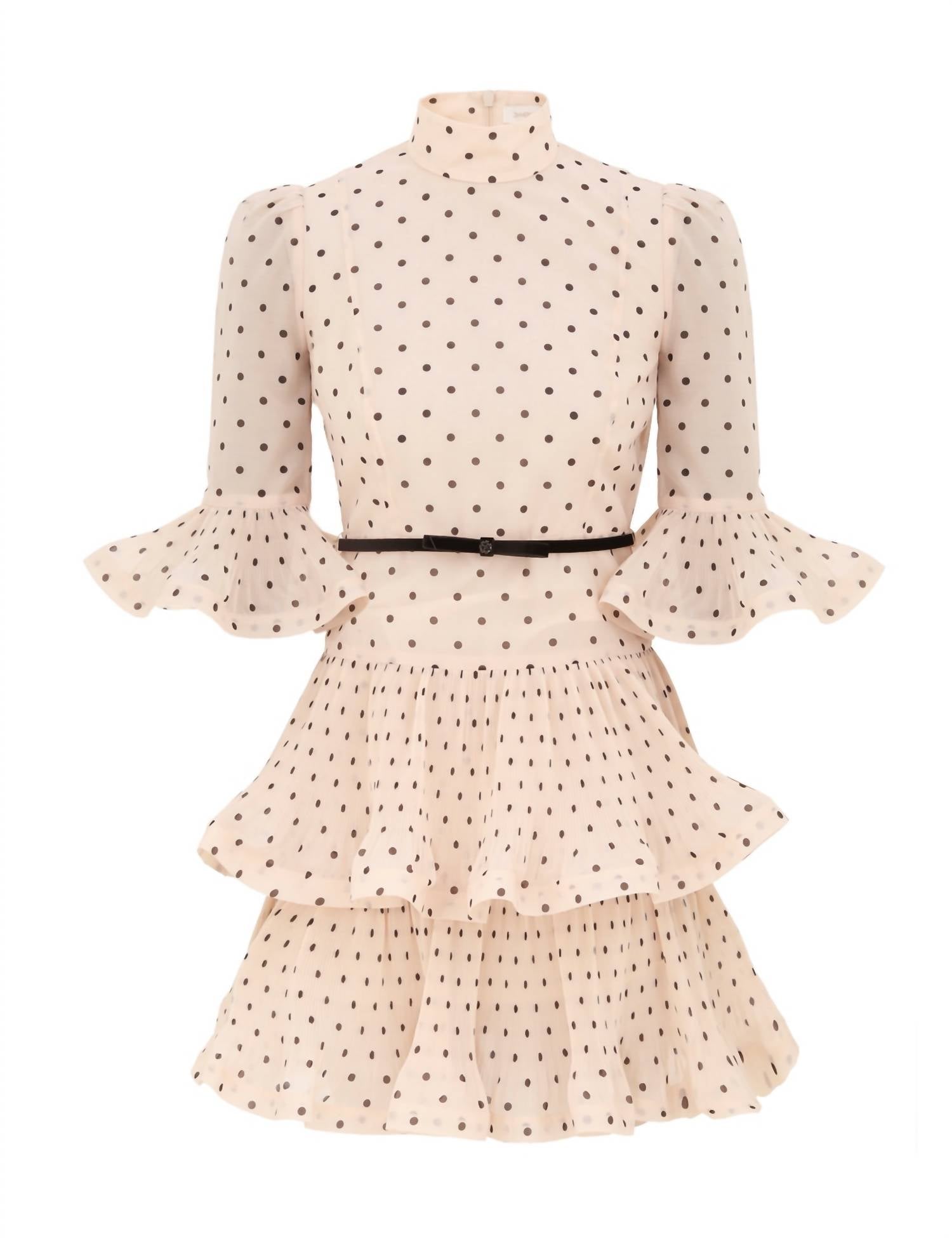 A short and breezy dress for those warmer days. Discover the Zimmermann Pleated Sleeved Mini Dress in Cream/Black Polka Dot, a standout piece from their Hypnotic Fall 2025 Collection. This sophisticated mini dress features elegant elbow-length sleeves with frilled cuffs and an A-line silhouette. The design includes a chic stand collar with a self-tie necktie, cascading ruffles on the tiered pleated skirt, and a removable bow belt to accentuate the waist. Crafted for refined occasions, this dress closes with an invisible zip at the center back and requires dry cleaning for care.