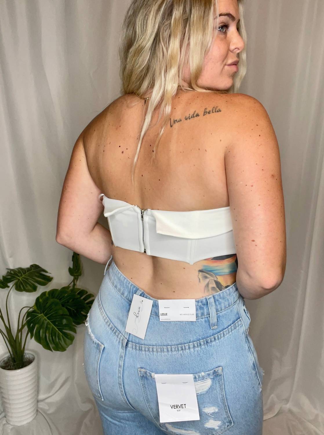 Pair this crop top with your favorite high-waisted jeans or maxi skirt. Step into the spotlight with the Main Character Bustier Crop Top by MABLE, an off-white staple for your night out. This strapless piece features a distinctive foldover detail and a sleek tube top silhouette, ensuring a snug fit with its stretchy fabric. Constructed from 95% polyester and 5% spandex, it offers both comfort and style. Closure: Convenient back zipper. Available in sizes SM (4-6), MED (8-10), and LRG (12-14); consider sizing up for a longer fit if you have a larger bust.