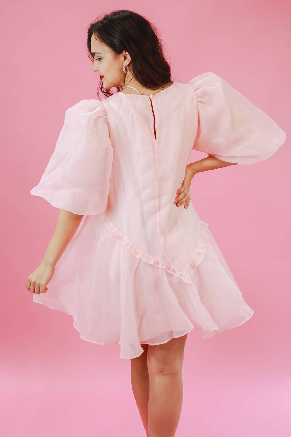 Soft pink-hued dress featuring lightweight flowy organza material, a rounded neckline and upper back with a button closure, semi-sheer puff sleeves, tiered flattering babydoll silhouette that falls into a straight mid-thigh length hemline. Fully lined. Model is 5'5", bust 34", waist 26.5", hips 35", wears small. Dry clean. 100% Polyester.