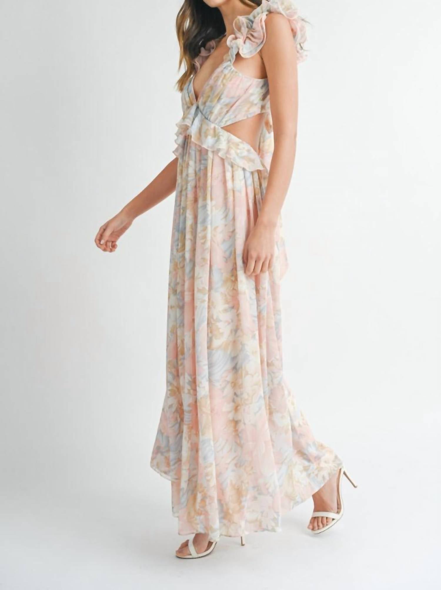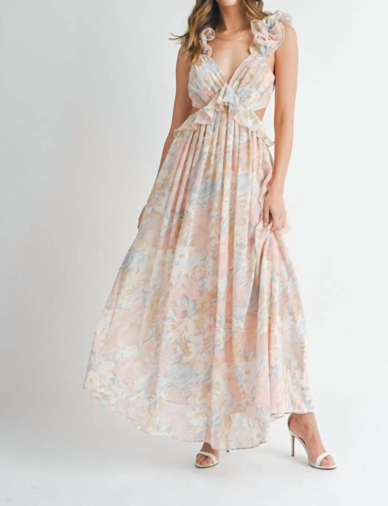 Comfortable and cute, this casual day dress has it all. Discover the Carrie Ruffled Floral Dress by MABLE, a perfect blend of style and comfort for spring dinners and festive occasions. This sleeveless A-line dress showcases a feminine floral pattern, with ruffled accents and a ruched bust enhancing its flattering silhouette. Crafted in a maxi length, it includes a back self-tie and zip closure for a secure fit. Care instructions: Machine wash.цветочный