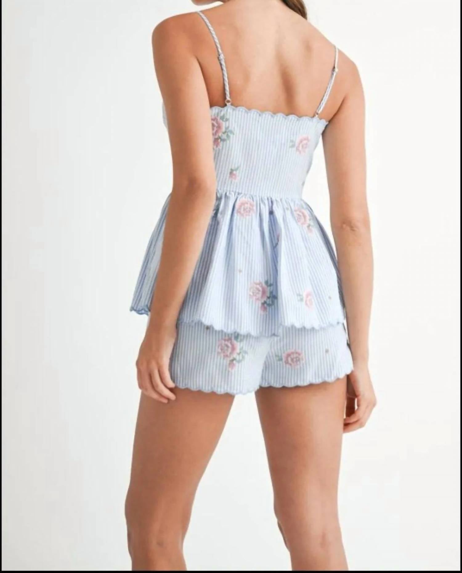 High-waist is here to stay and we especially love this style short. Introducing the Embroidered Shorts by MABLE, a chic addition to your summer wardrobe. These stylish blue high waist shorts are crafted from quality polyester and feature a charming striped floral embroidery with a scalloped hem. Designed without pockets, they offer a clean silhouette perfect for a vintage-inspired look. Care: Machine wash and tumble dry for effortless maintenance.