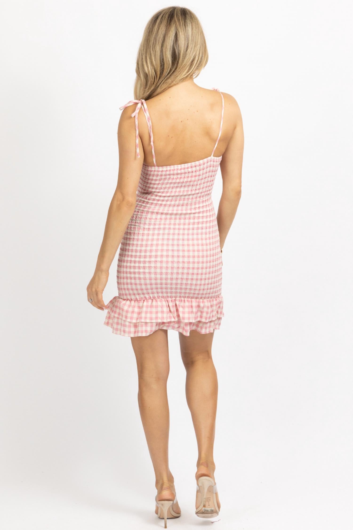 Smocked, ruffle hem, spaghetti straps, tie front detail, open front. 80% polyester, 30% rayon. The model is wearing a size small. Height 5'8, and the dress size 2.