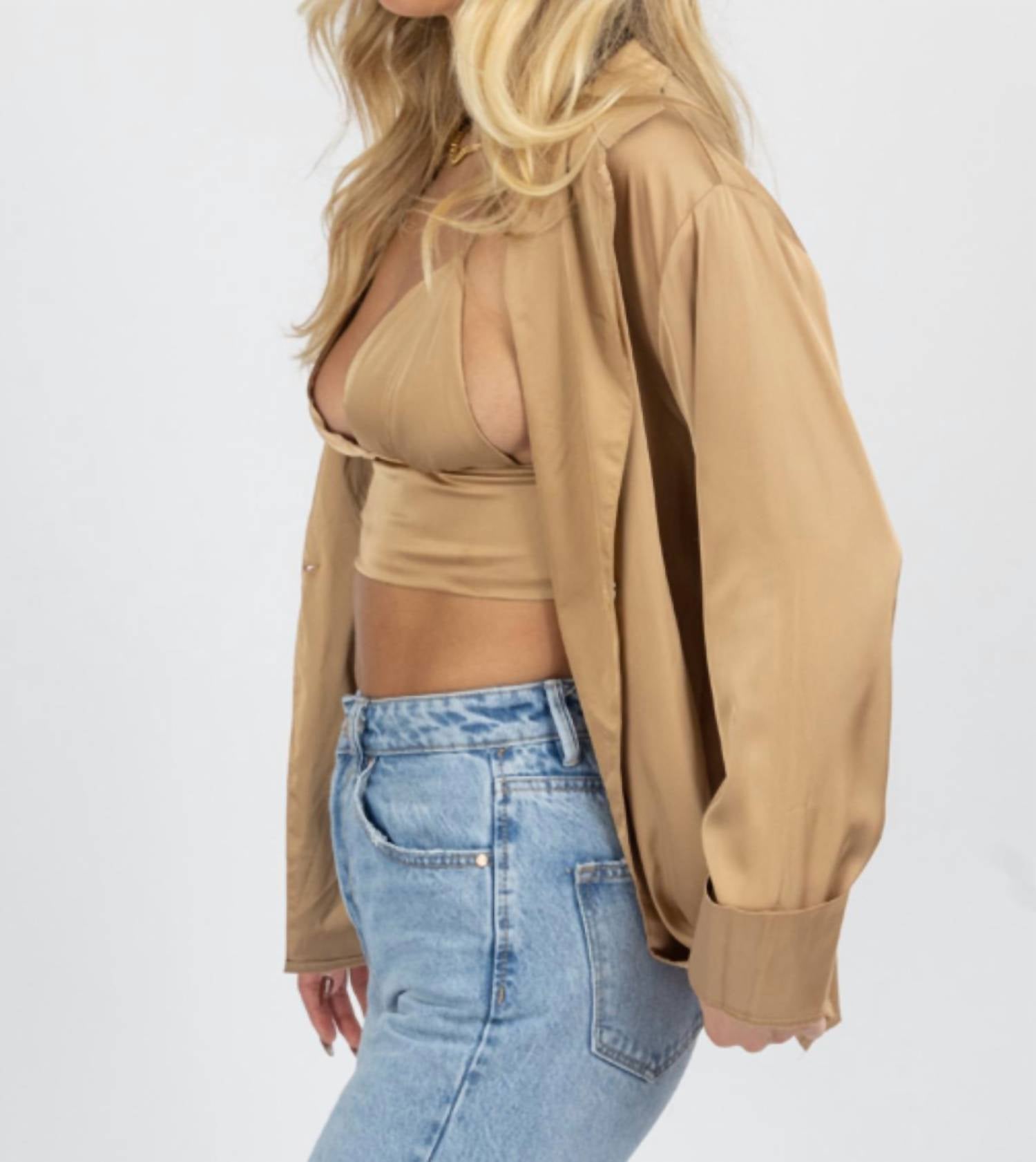 Sold together, long sleeve relaxed button down, bralette, collared. 100% polyester. The model is wearing a size small, height 5'8, and the dress size 2.