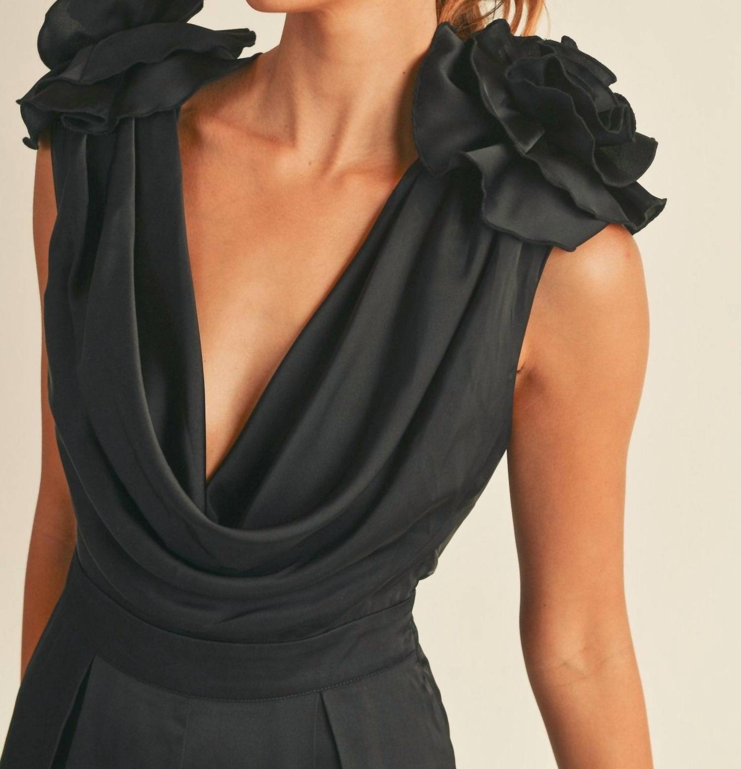 It doesn't take much for this one piece to look effortlessly cool. Add some statement jewelry to dress it up, or throw on some sneakers for a more casual vibe. Elevate your wardrobe with the Floral Applique Deep Cowl Neck Jumpsuit by MABLE, designed to make a bold statement. This elegant black piece features wide legs and a stunning satin 3D floral applique that enhances the deep cowl neck and open back. Composed of 100% Polyester, this jumpsuit offers a relaxed fit with a self-tie closure. Care is effortless with dry clean maintenance recommended.