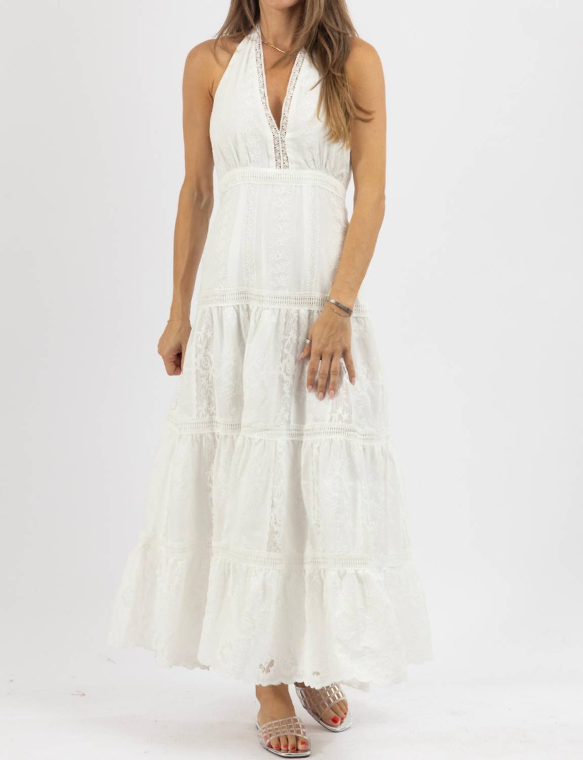 Who doesn't love a good maxi dress? This one you'll be reaching for season after season. Discover the Augusta Eyelet Maxi Dress by Mable, an elegant choice for any summer escapade. Crafted from 100% polyester, this stunning white dress features a halter neckline and an empire waist silhouette adorned with embroidered lace details. Its maxi length and sleeveless design make it perfect for embracing the boho chic vibe. Closure is secured with a tie, designed for a graceful yet comfortable fit. Model Naomie stands at 5'8" and wears a size small.