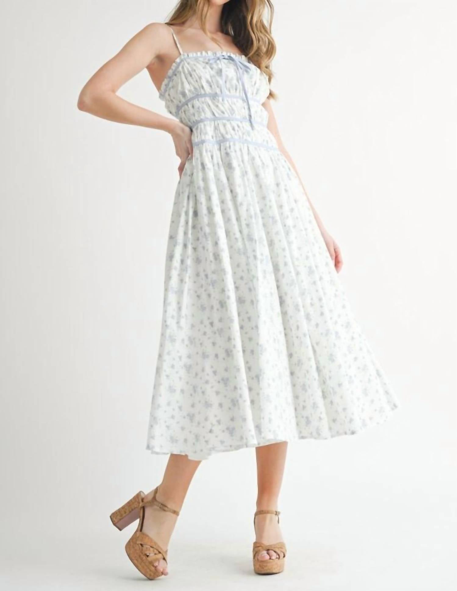 The perfect length dress does exist. Elevate your wardrobe with the Baby Blue Floral Midi Dress by MABLE, designed for effortless elegance. This dress features adjustable spaghetti straps for a perfect fit and a flattering ruched bodice, complete with contrast color straps and a front self-tie detail. Made from 100% Rayon, this pull-on style is both comfortable and stylish, ideal for summer vacations. The delicate floral pattern and lining add to its chic boho vibe.