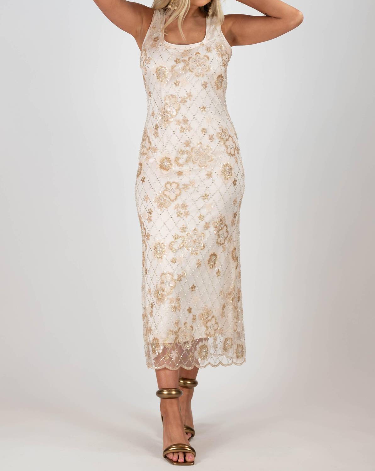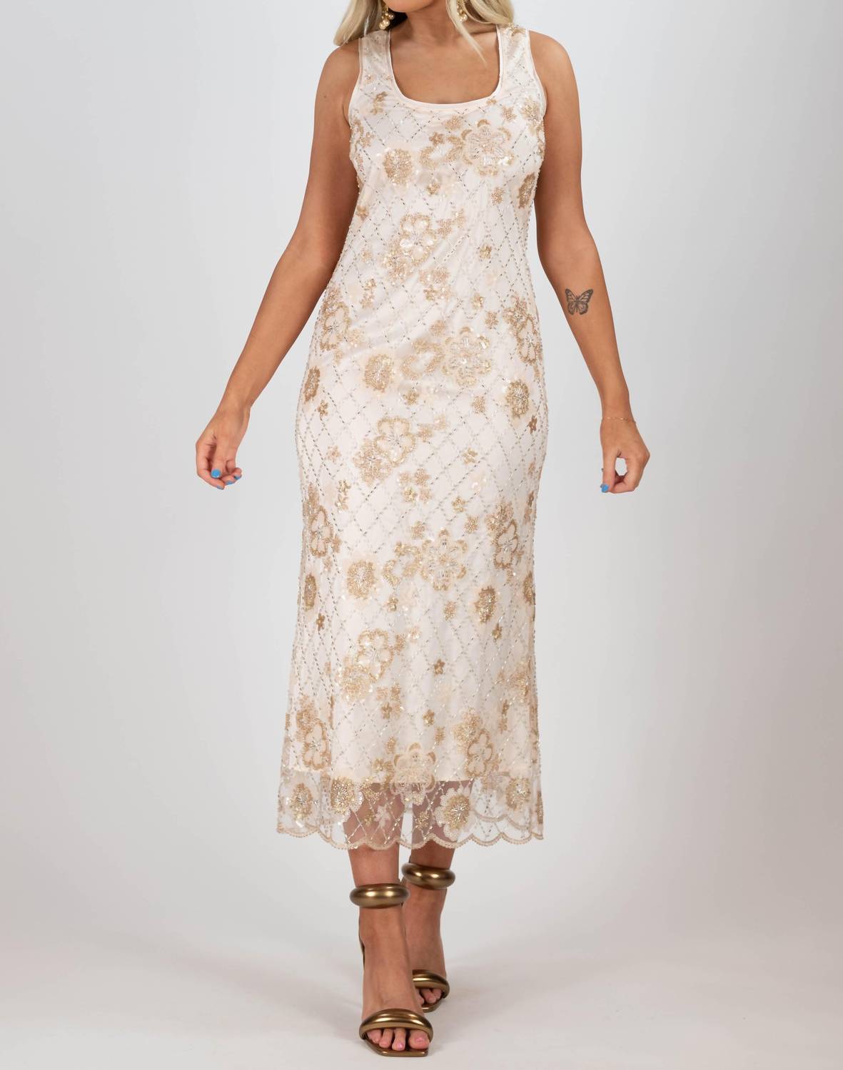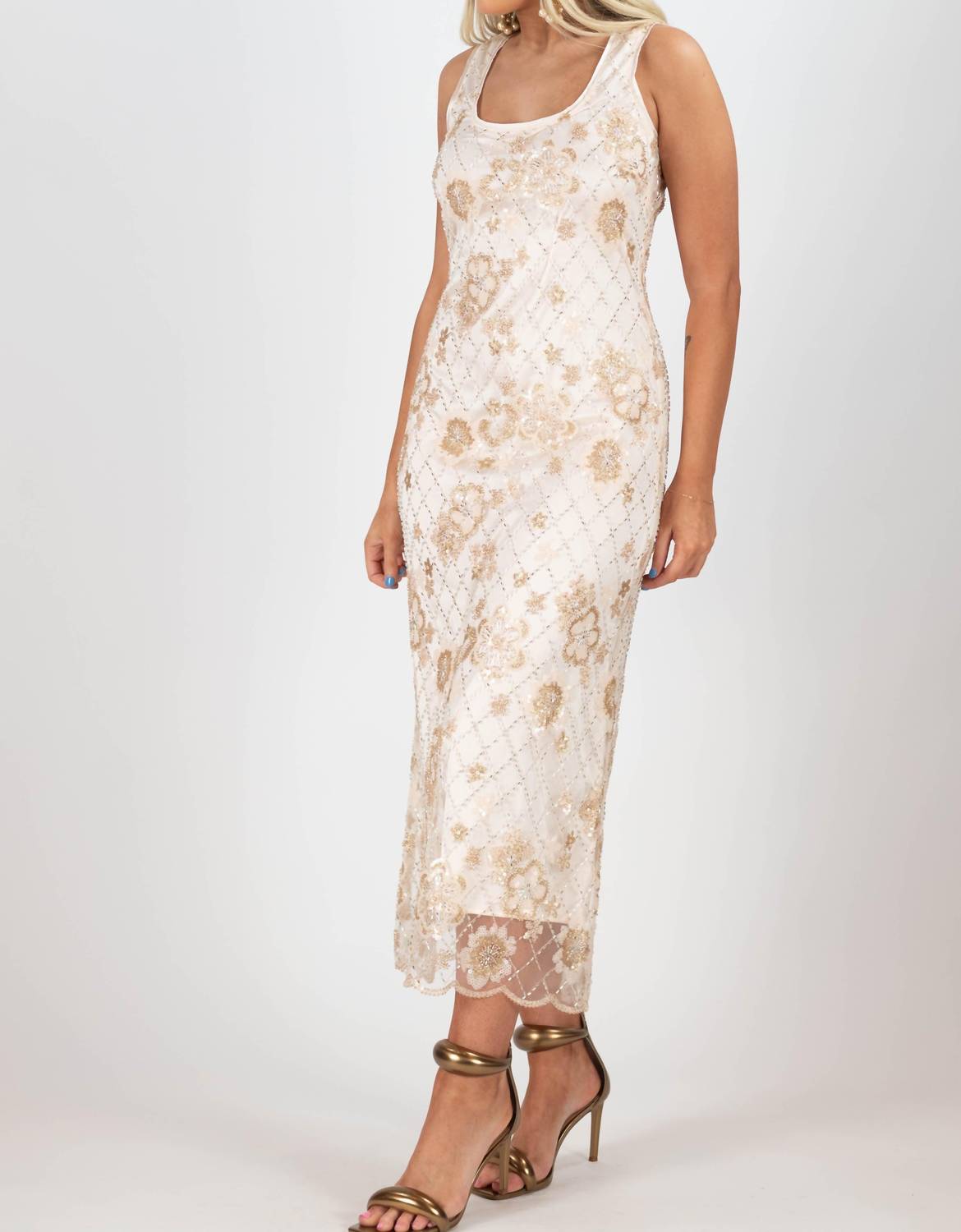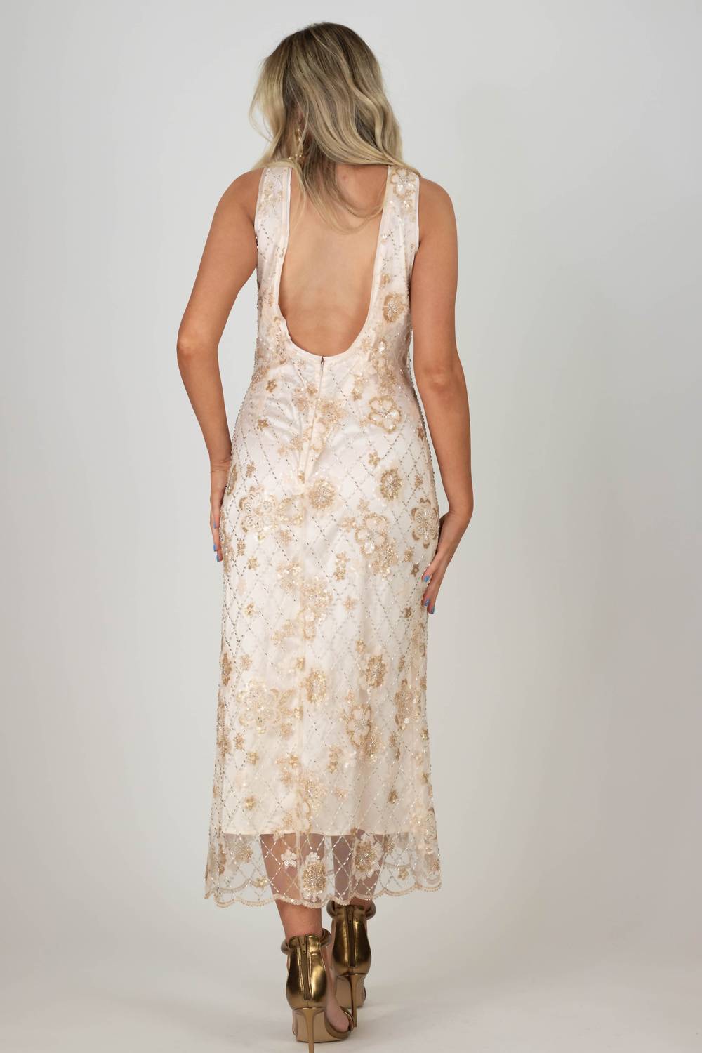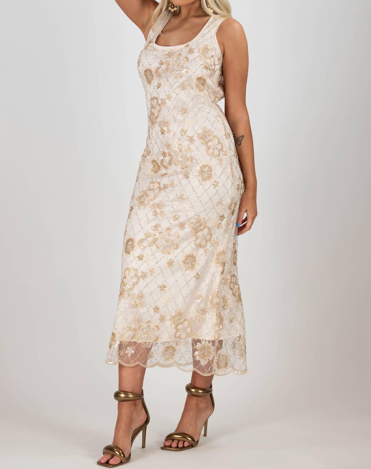 A midi dress so versatile, your options for wearing it are endless. Step into elegance rendered in a chic cream hue perfect for any occasion. Sleeveless dress features a scoop neckline. Made from 100% Polyester. Flattering midi length with a relaxed sheath silhouette. Boasts intricate scalloped beading with floral details and a low back for added allure, complete with a zip closure. Made to be both lightweight and stylish. Requires dry cleaning for care. Model Isabella is 5'6" with measurements 34" bust, 26" waist, 35" hips, and wears a size small, true to size fit.