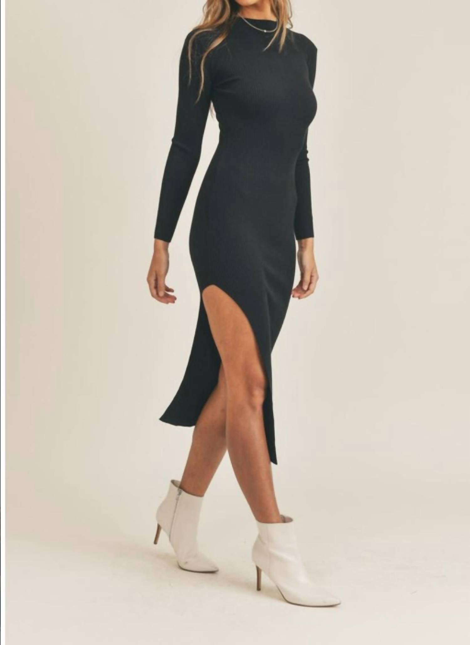 Mable - Long sleeve midi sweater dress with one side high slit.