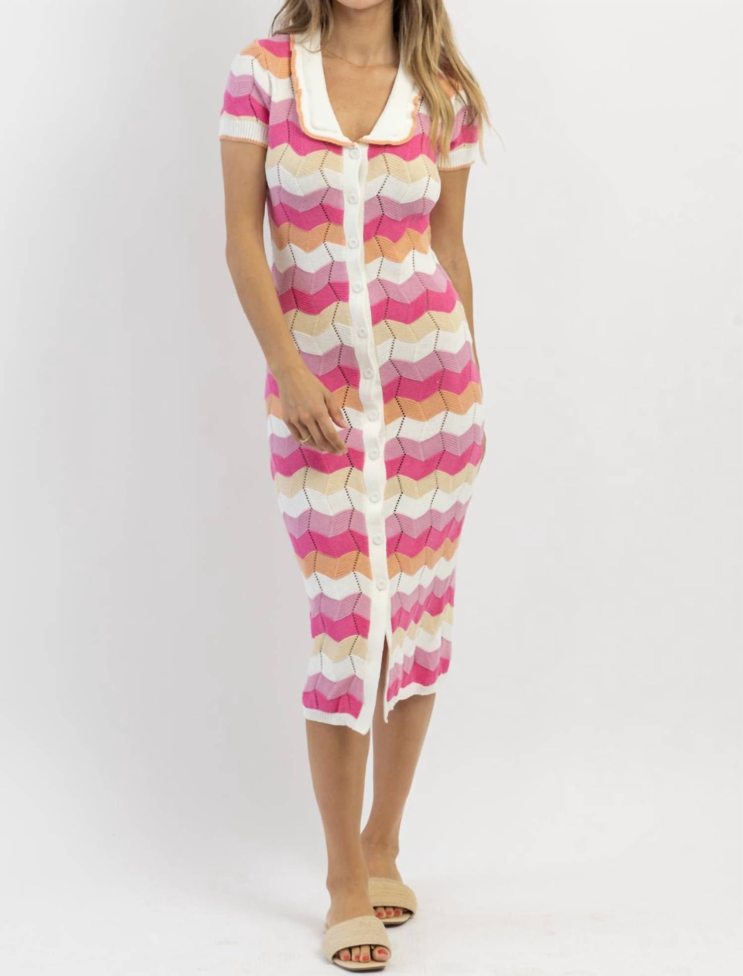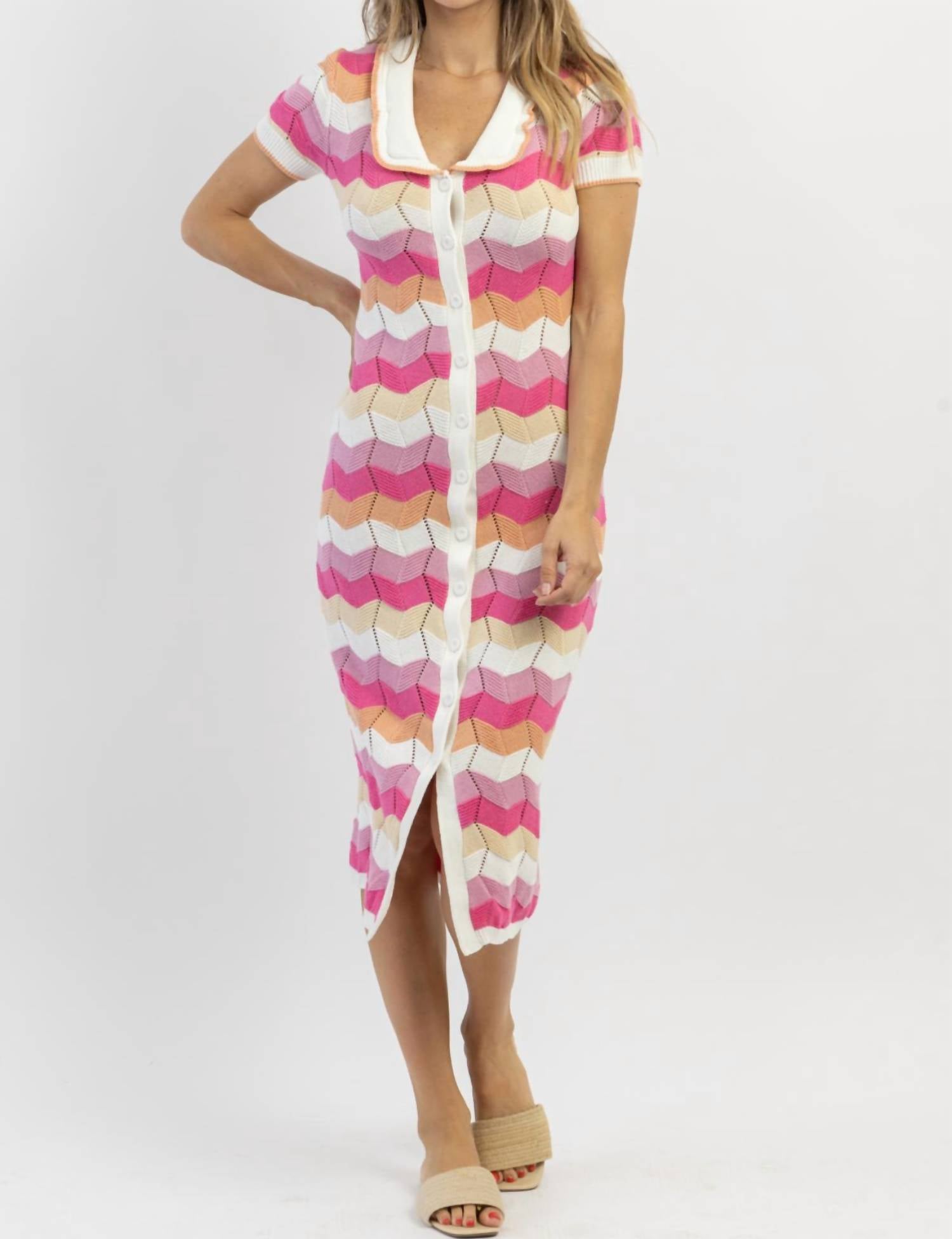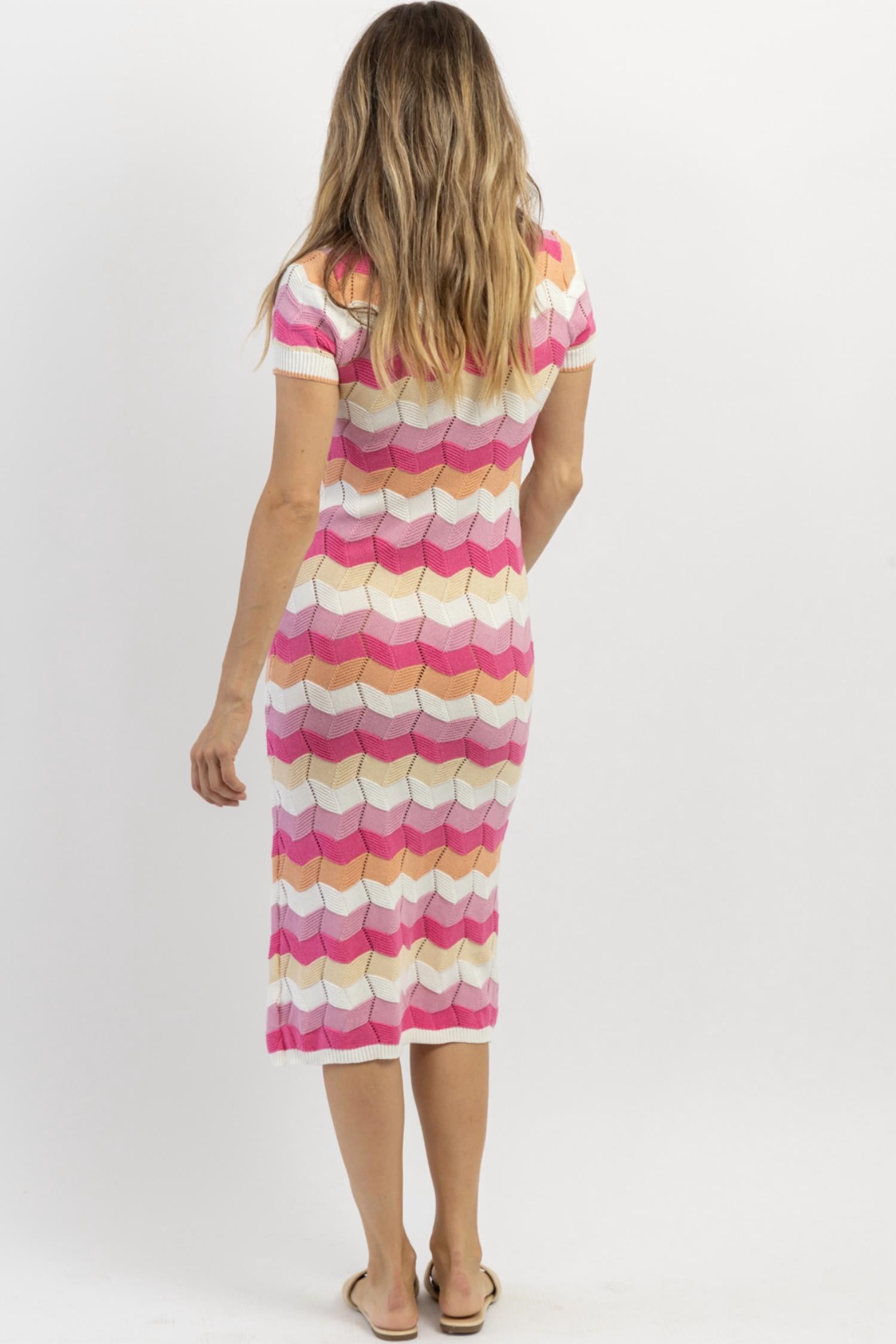 Crochet throughout, striped, button front detail, short sleeves, midi length, contrast collar. 100% cotton. The model is wearing a size small, height 5'8, and the dress size 2.