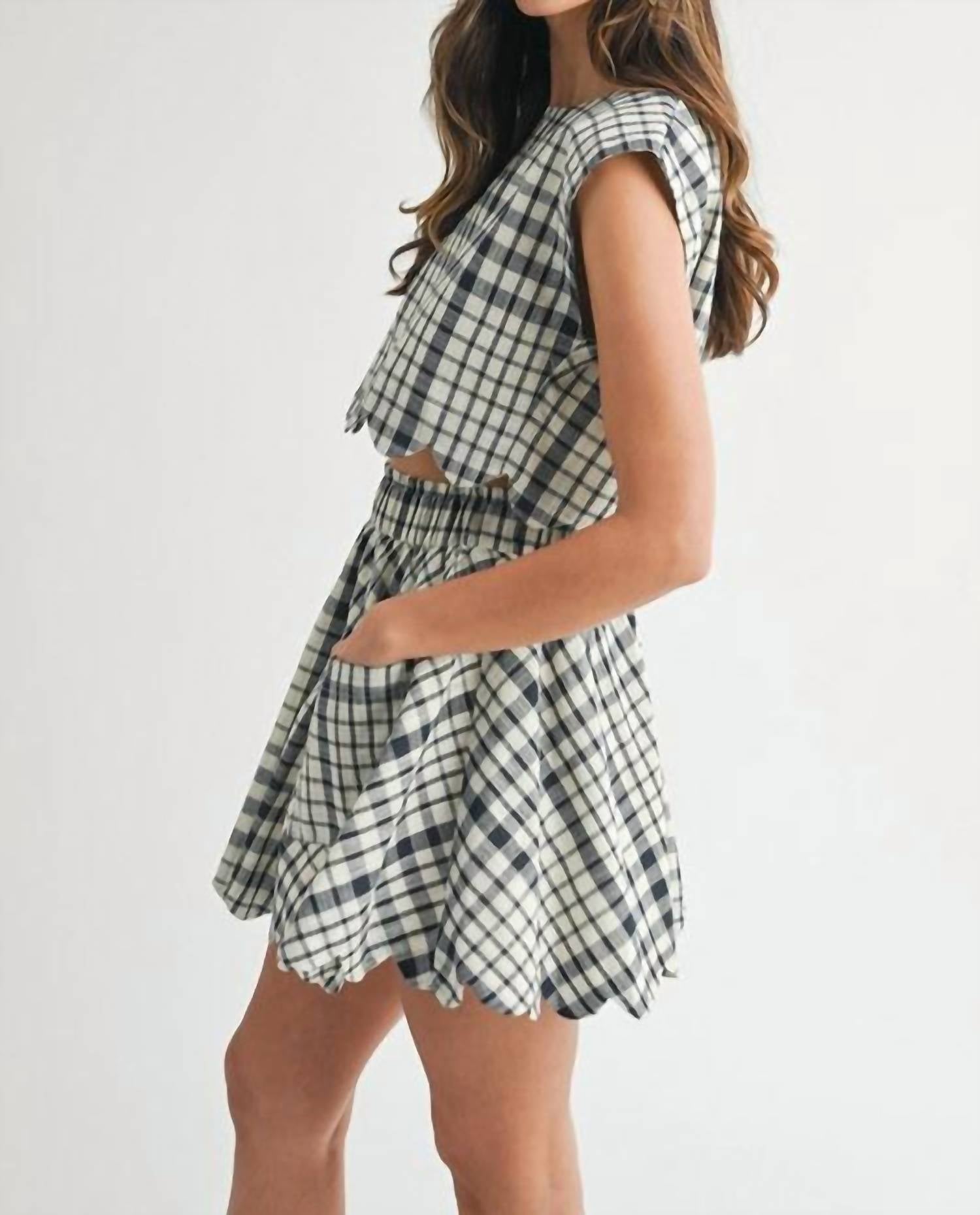 Pair this crop top with your favorite high-waisted jeans or maxi skirt. Unleash your playful side with the Bold Gingham Plaid Top by MABLE, a chic addition to your summer wardrobe. Crafted from a 10% Linen 30% Polyester 60% Rayon blend, this crop top features short sleeves and a fashionable scalloped hemline. The back button closure ensures easy wear and complements the vibrant plaid pattern perfectly. Style this piece to add a pop of personality to any holiday party ensemble.