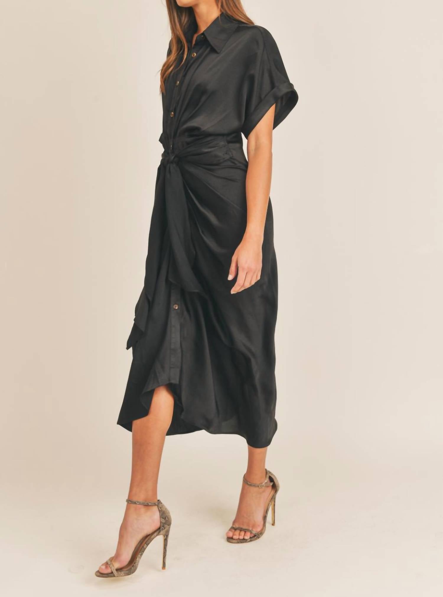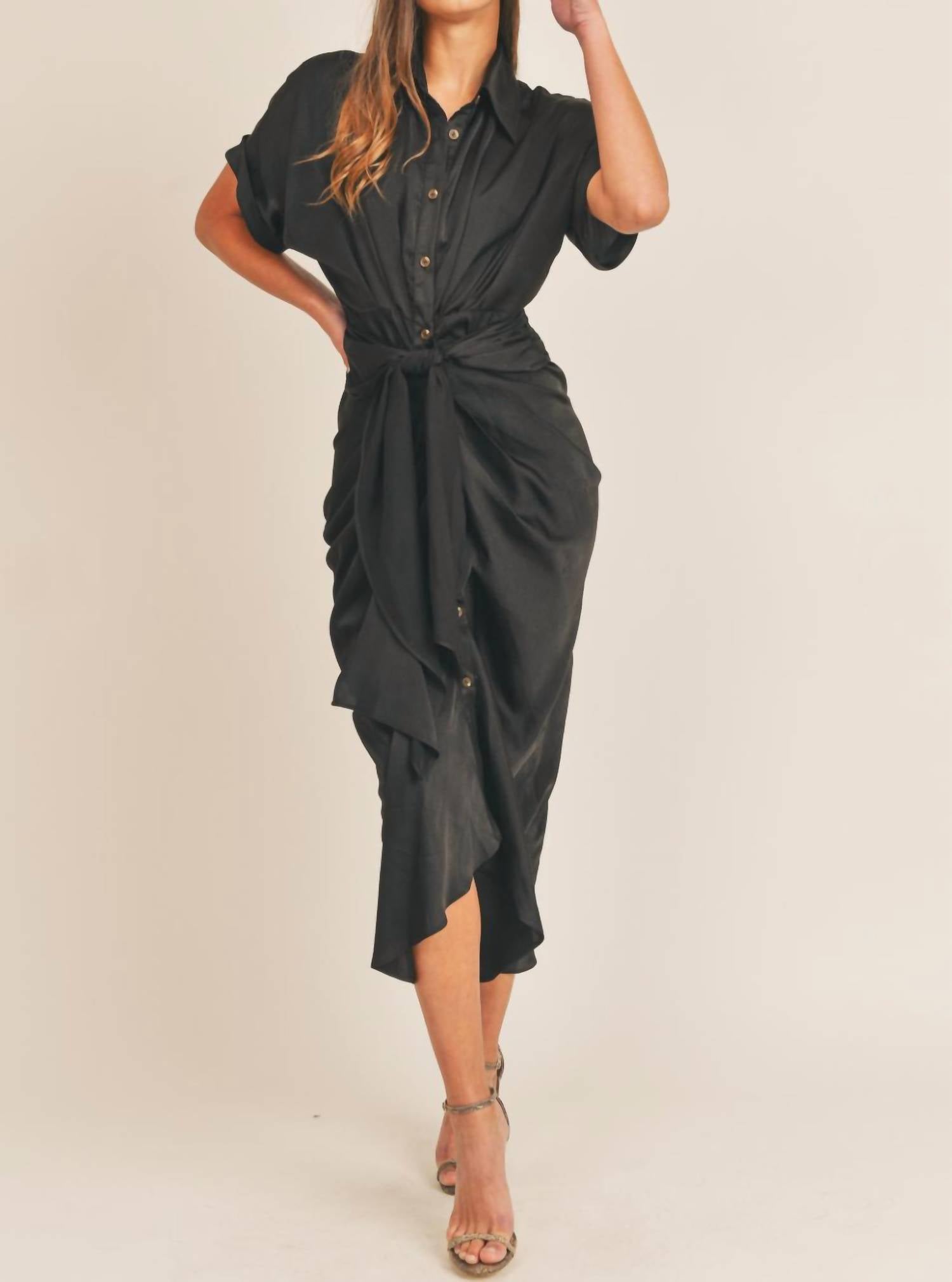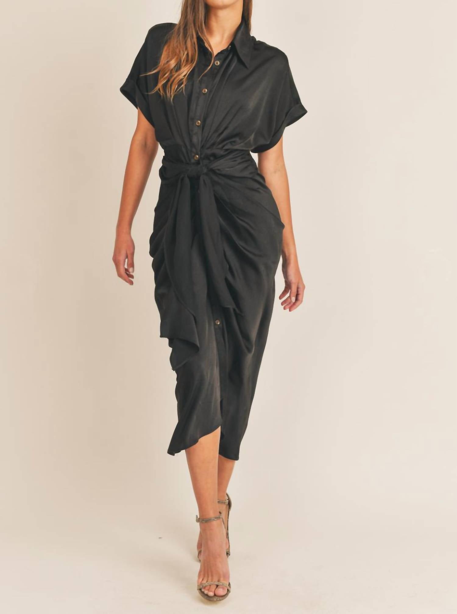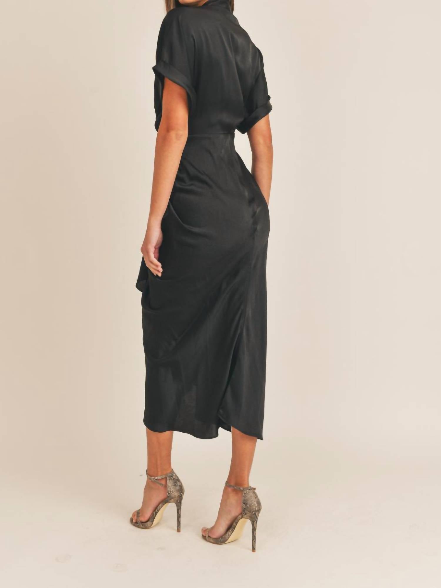 Just add slides or mules and you are good to go. Discover sleek sophistication with the Farrah Satin Midi Dress by MABLE, perfect for evening events and summer workwear. This dress is crafted from 95% polyester and 5% spandex, offering a light fabric feel and a flattering fit. It features short sleeves, a collared neckline, and a distinct wrap silhouette, enhanced by full-length button closure and a drop shoulder with a gathered fabric front tie. Care is simple with machine wash instructions.