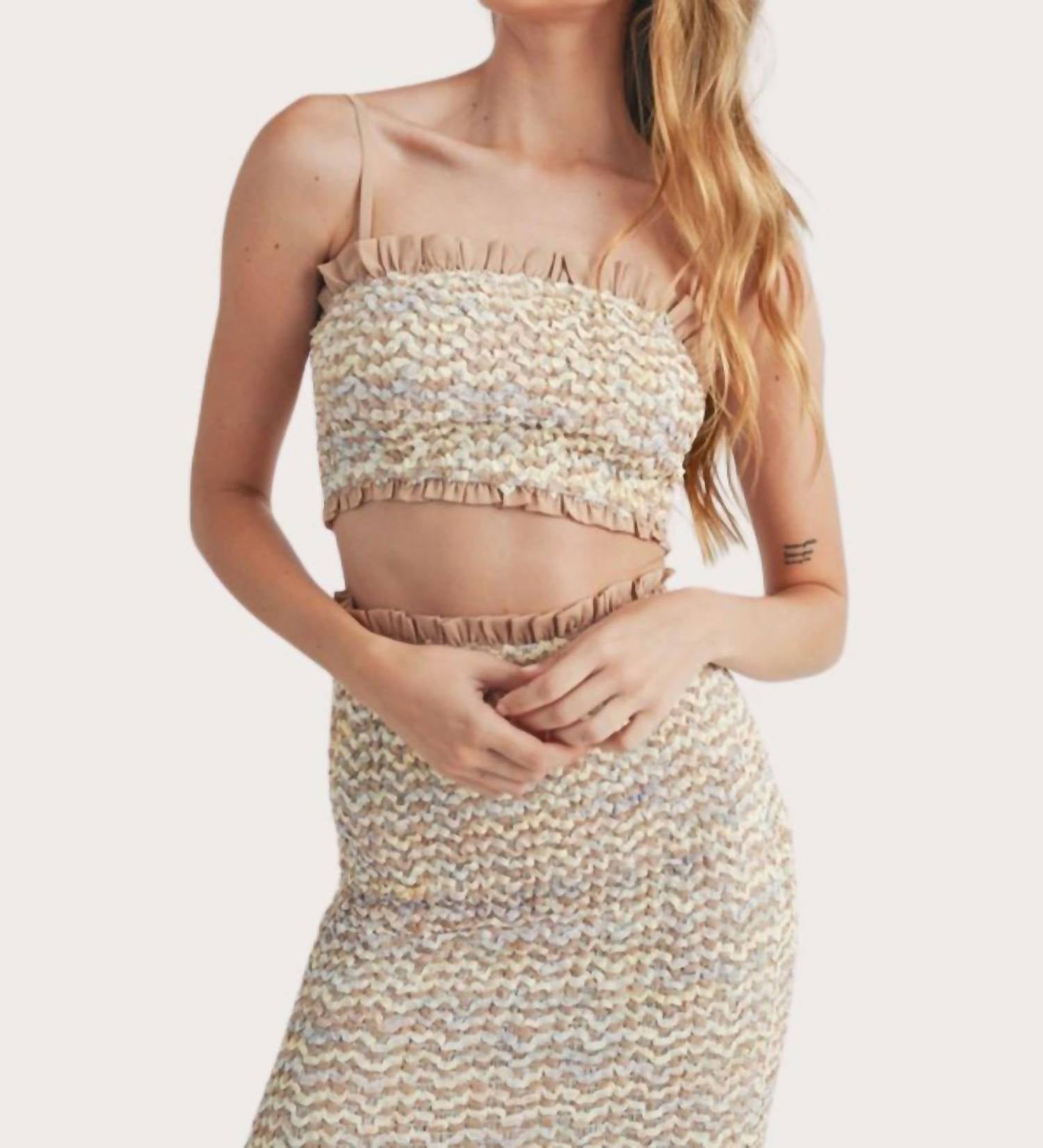 Show a little skin in this cute and casual crop top. Embrace your playful side featuring adjustable spaghetti straps for a personalized fit. Stylish crop top boasts a quirky patterned design in a multi-color textured fabric. Made with a flattering smocked ruffle design. Offers both comfort and style. Hand wash.