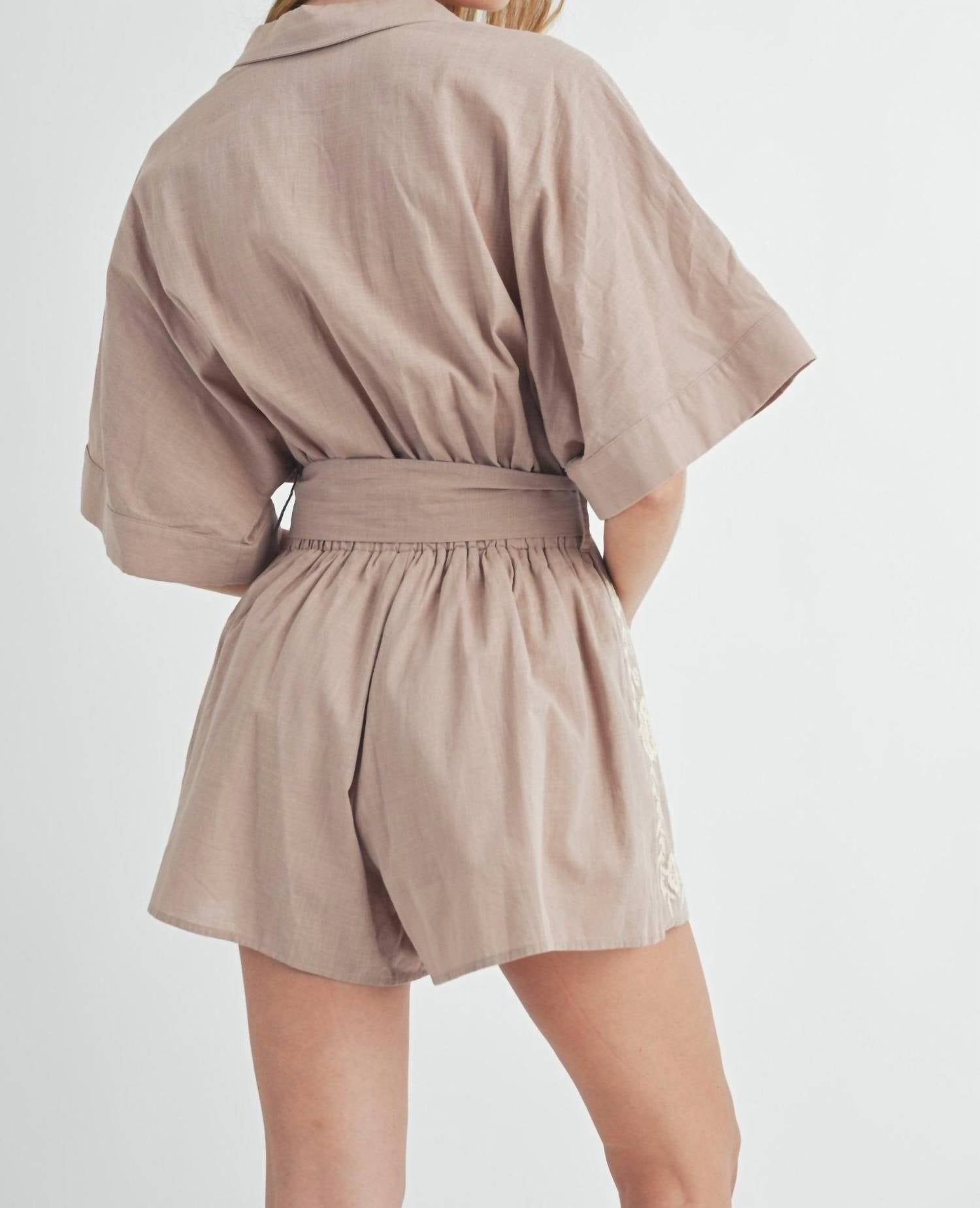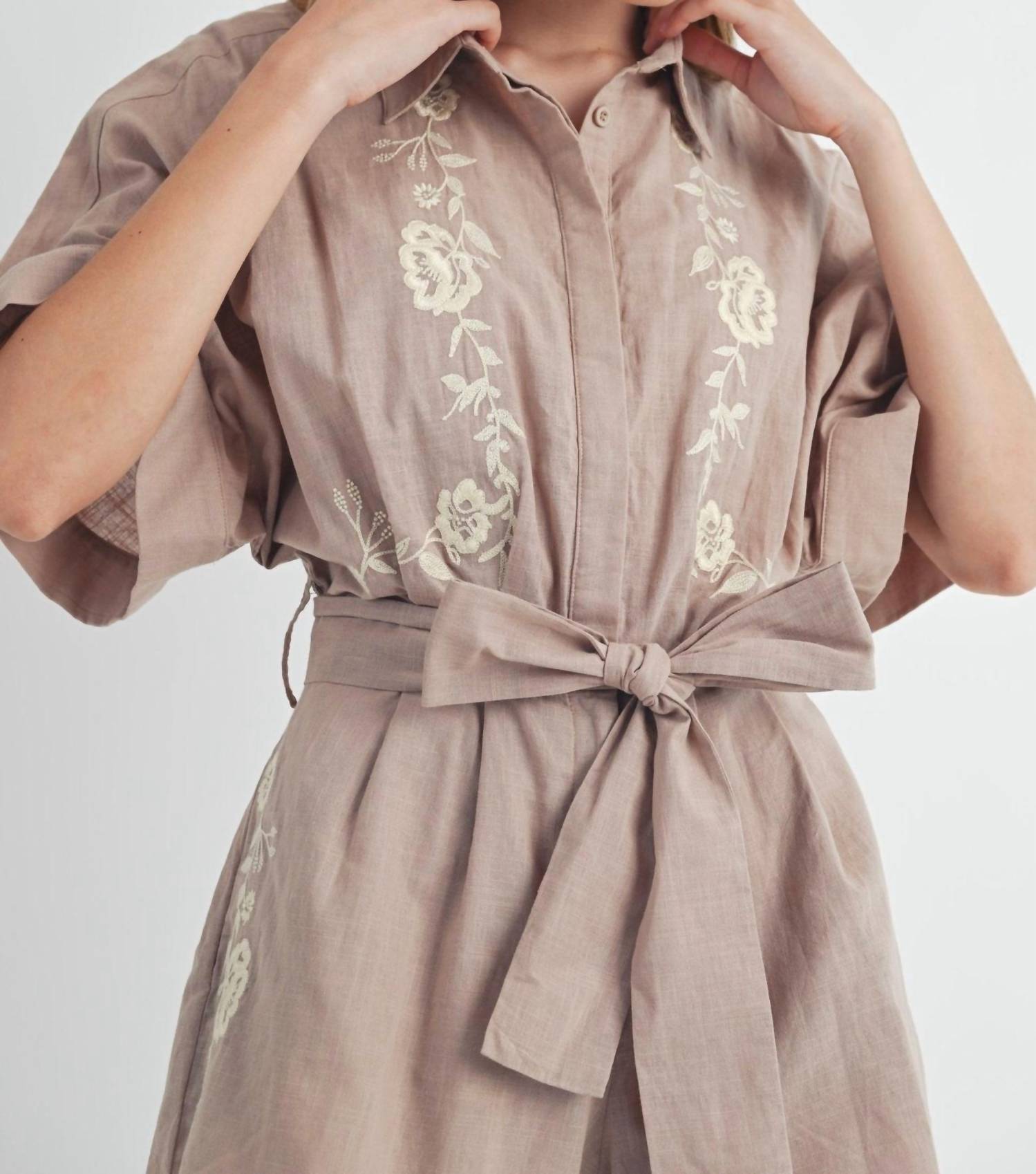 The perfect outfit choice when you you need something quick to throw on and still want to look efforlessly cool. Introducing the Lilith Romper by MABLE, a Boho Chic piece perfect for summer vacations and Thanksgiving gatherings. This tan romper showcases short sleeves and stylish floral embroidery, with a relaxed fit, flared leg design and convenient pockets for added functionality. It features a button closure and an elastic waistband complemented by a self-tie belt for a flattering silhouette. Easy to care for, simply machine wash and tumble dry.