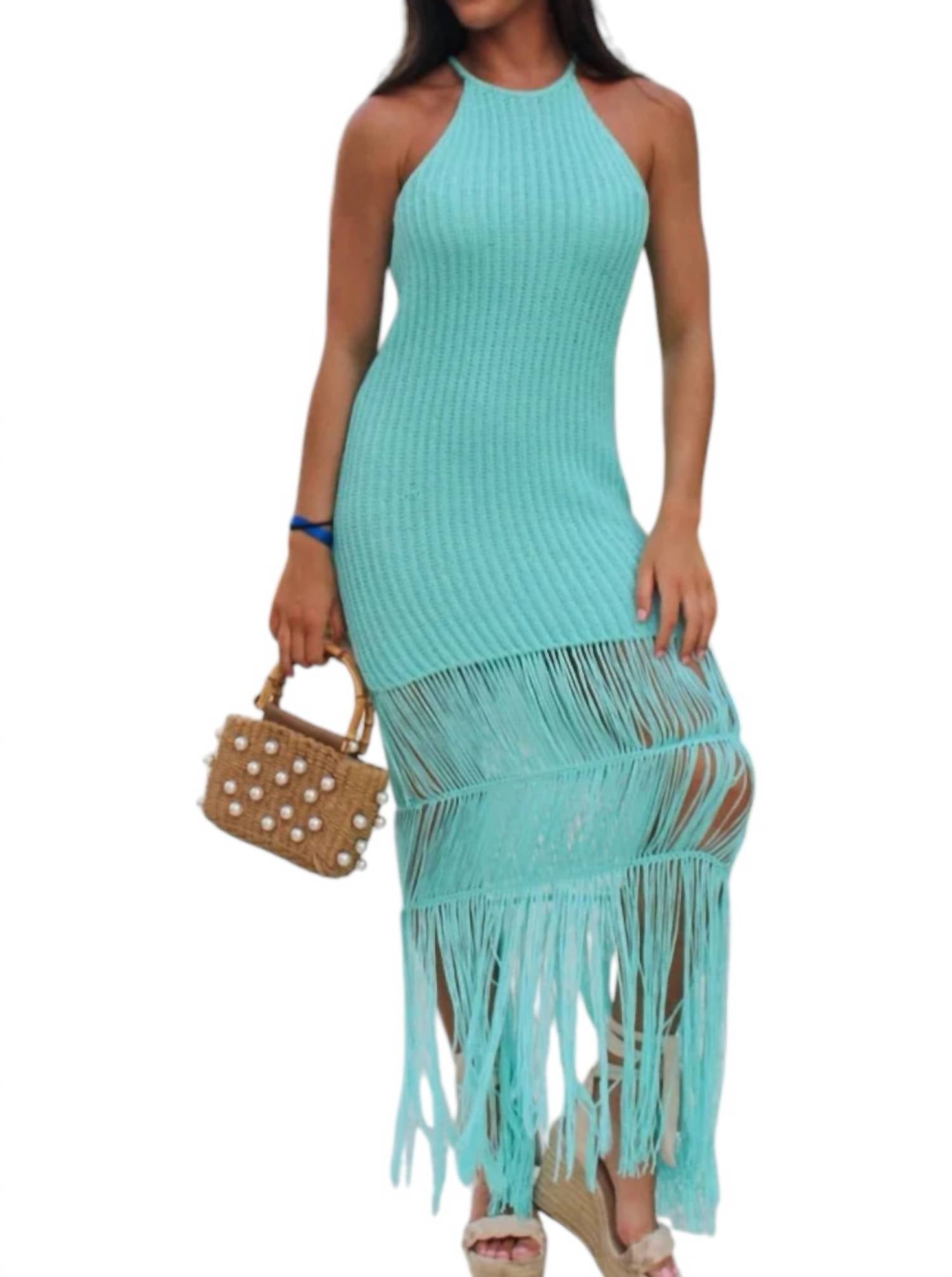 A midi dress so versatile, your options for wearing it are endless. Introducing the Crochet Knit Midi Dress by MABLE, a captivating piece in a textured blue design that blends elegance and comfort. With a sleeveless, halter neckline, this sheath midi dress features intricate crochet knit detailing and a chic fringe hem. Made from 100% Acrylic, it offers effortless style with a pull-on closure. Perfect for minimalist summer evenings and special occasions, this dress promises to make a statement.