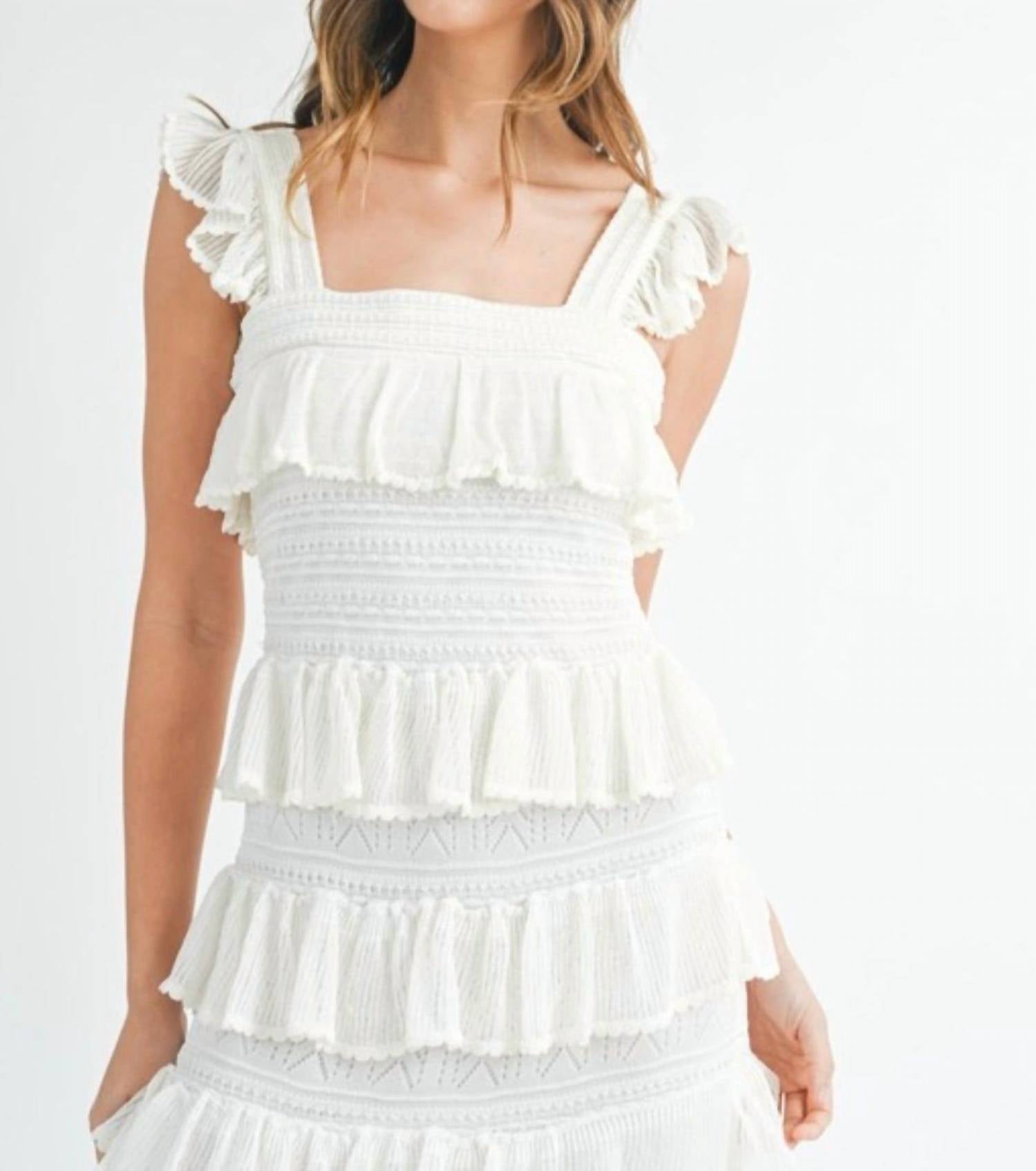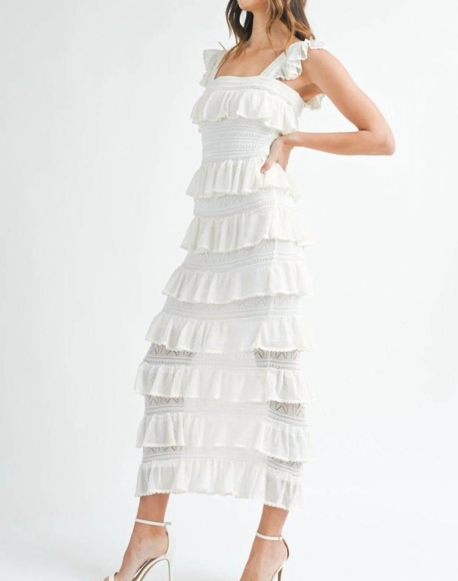 The perfect length dress does exist. The Isabella Midi Dress by MABLE offers a sleeveless design with a stylish squareneck and graceful ruffle tiers, perfect for summer weddings. With a textured A-line silhouette in a minimalist cream color, this dress is both elegant and comfortable. Composed of a self-material of 100% Viscose and lined with 100% Polyester, it offers a lightweight and breezy fit. Closure is seamless with a convenient pull-on style.