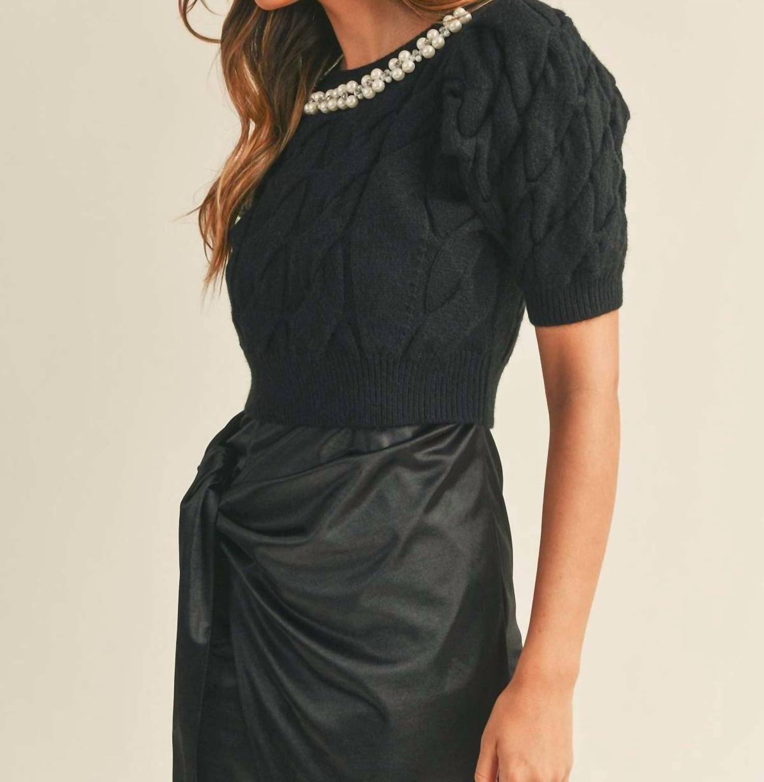 Experience the perfect blend of comfort and style with this trendy crew neck sweater, designed to effortlessly elevate your wardrobe. Pair it with your favorite denim and loafers for the perfect look. Elevate your fall wardrobe with the Spellbound Bejeweled Sweater by MABLE, showcasing the latest in quiet luxury. This super-soft black piece features short sleeves and a textured pattern adorned with faux pearl and rhinestone details around the crewneck. Crafted from 65% Anti Pilling Acrylic and 35% Nylon, it effortlessly blends comfort with sophistication. Closure: Pull on. Perfect for adding an elegant touch to your ensemble this Thanksgiving season.