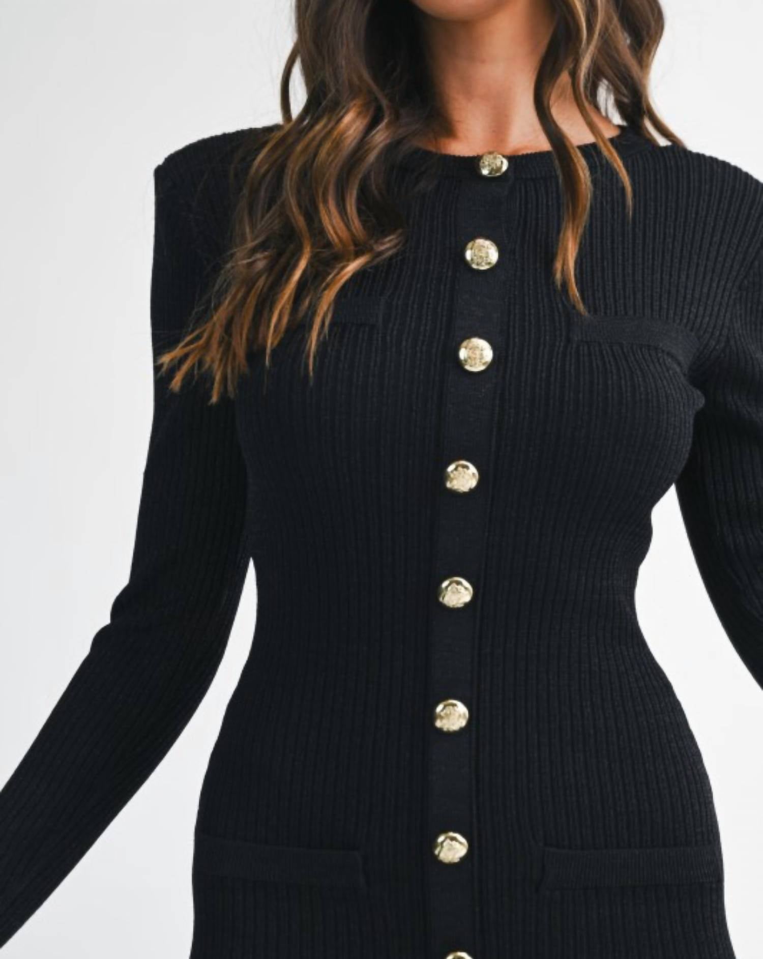 A long sleeve top you can wear with denim, skirts, well... just about anything! Elevate your evening look with the Women's Lurex Ribbed Knit Mini Dress by MABLE, a chic addition to your dinner party wardrobe. This long sleeve dress in classic black features a sophisticated crew neckline and a gold button front closure for an elegant touch. Crafted from lurex ribbed knit, it embodies a contemporary monochrome trend perfect for spring events.